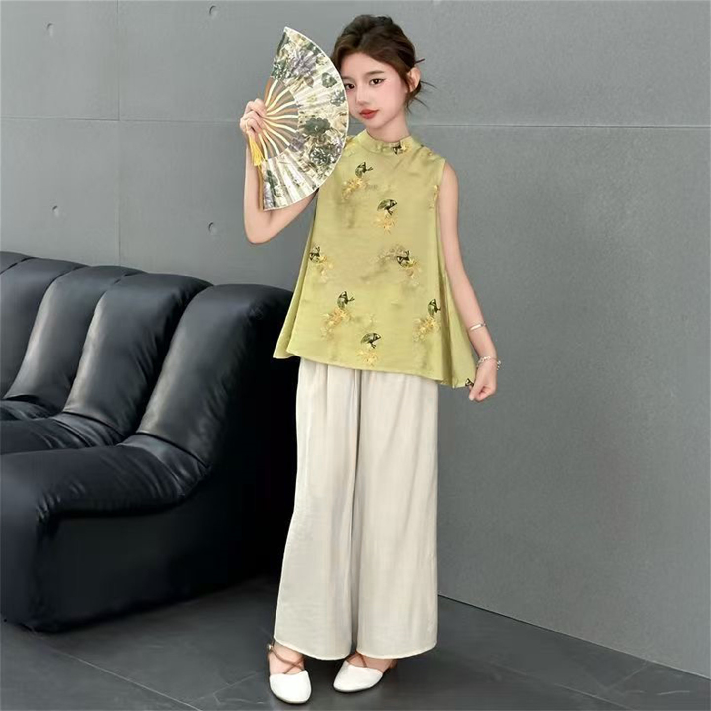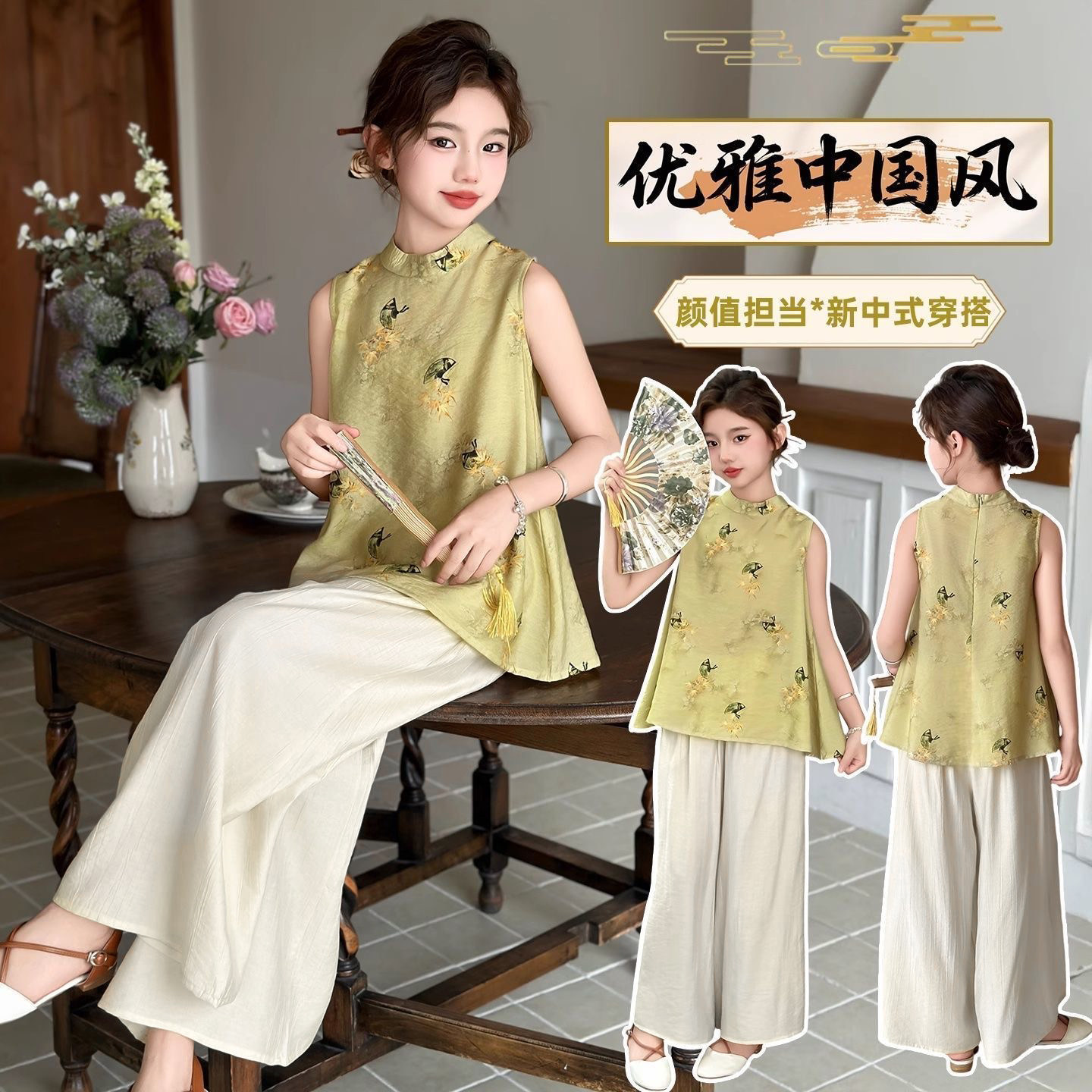 阔腿裤 女童夏季 两件套 上衣新中式 洋气小女孩无袖 国风套装 2026新款