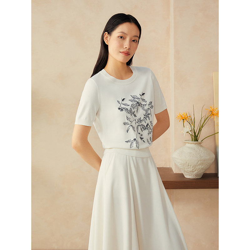 新款 周末花园 YINER音儿专选2025夏季 T恤绣花毛针织衫 天丝短袖由