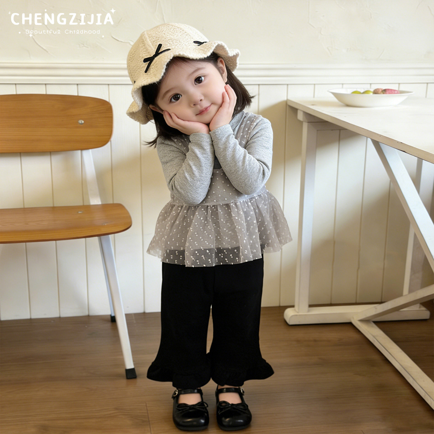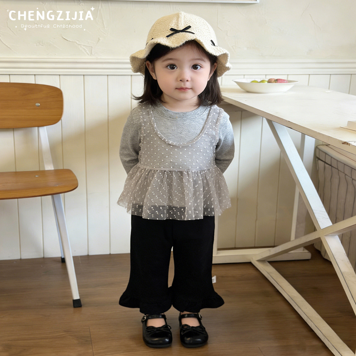 打底衫 女童春秋装 假两件上衣套装 女宝宝洋气长袖 子 婴儿休闲喇叭裤
