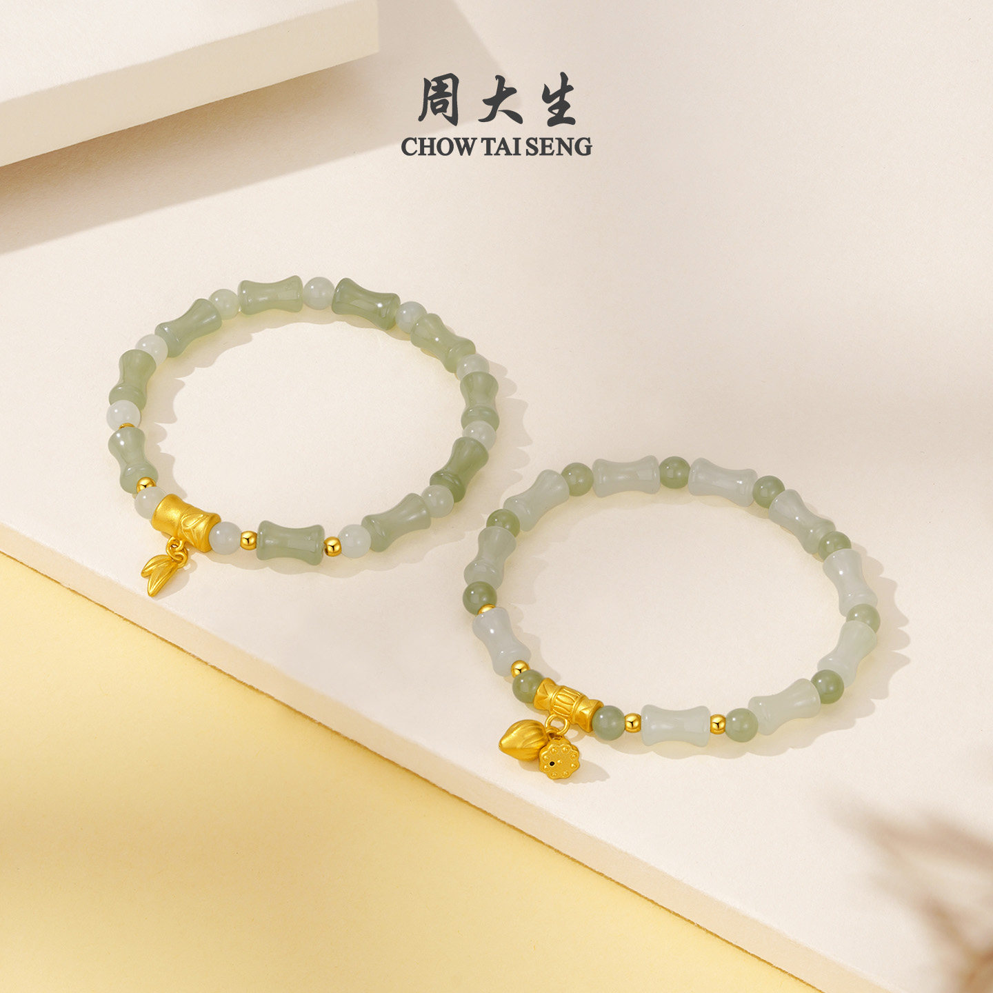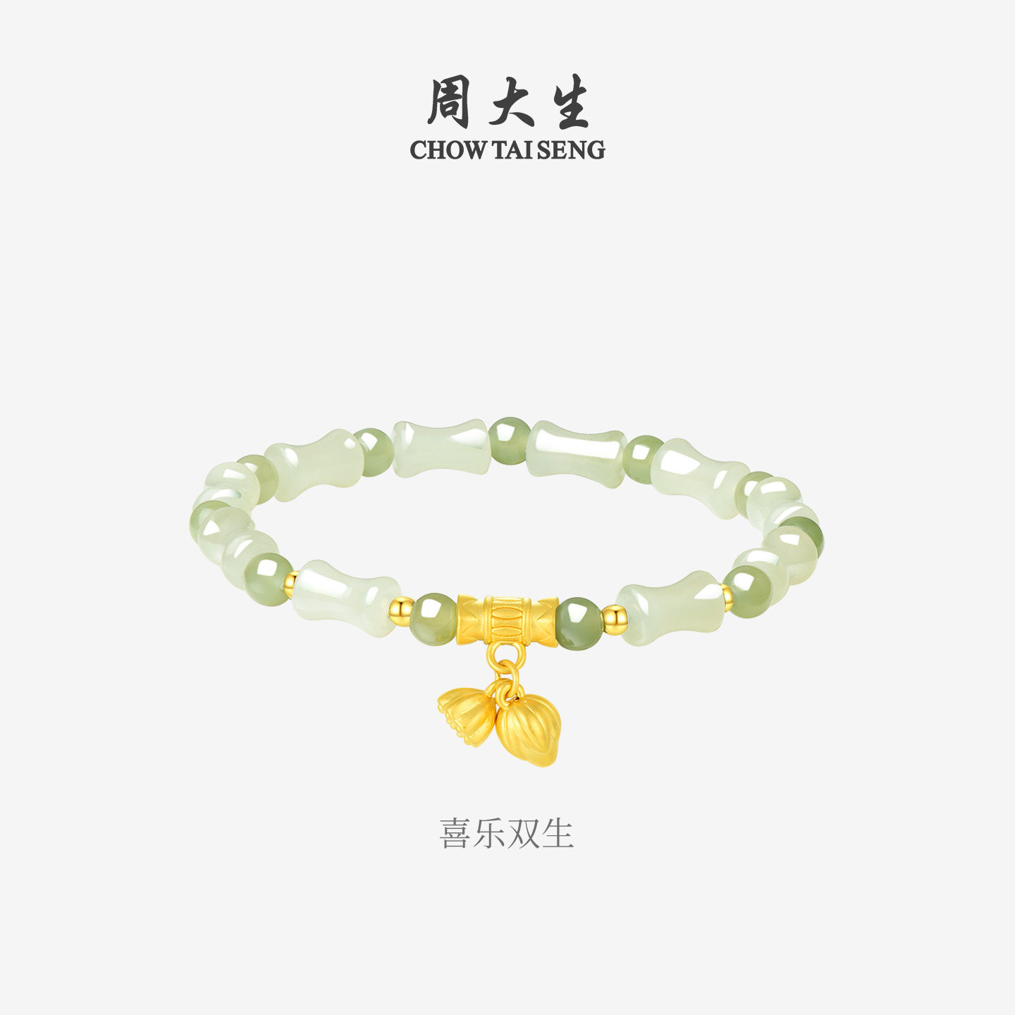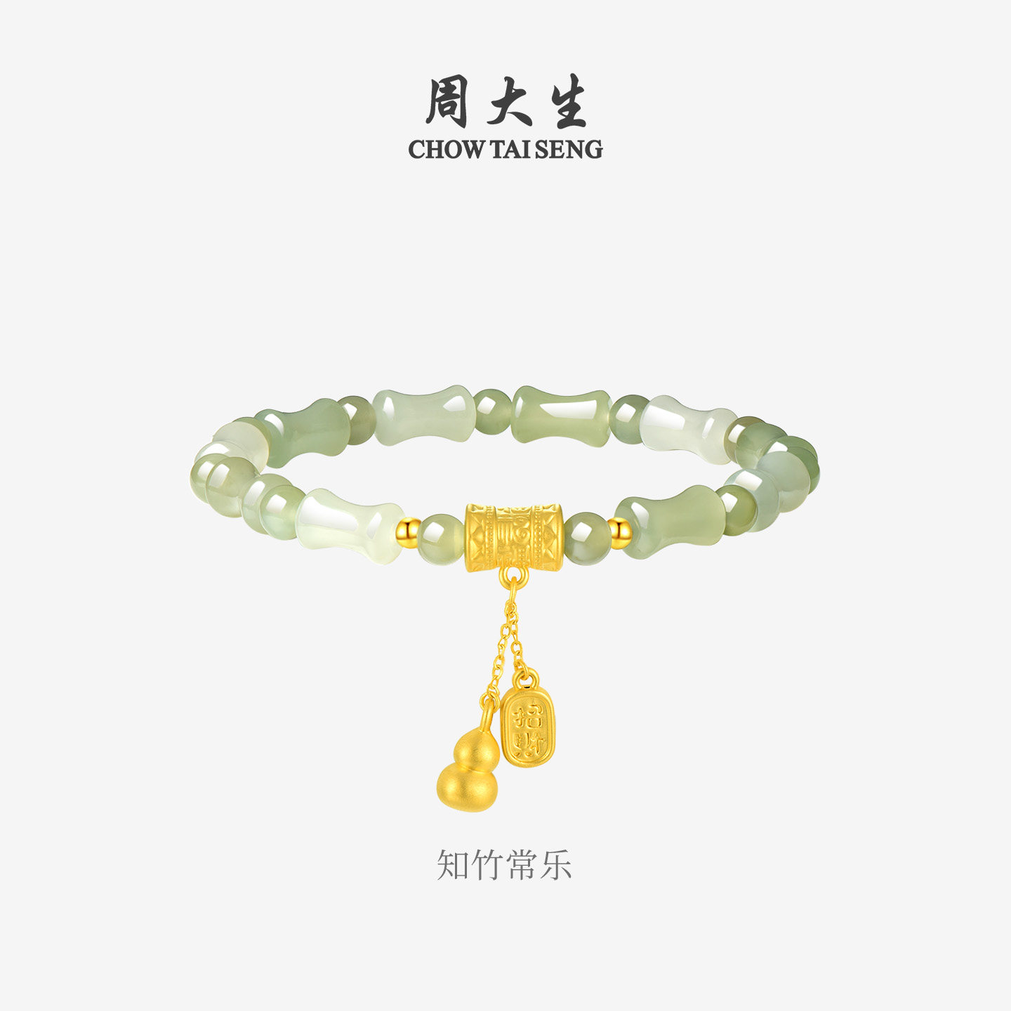 竹节葫芦硬金福牌手链送女友生日礼物 周大生黄金和田玉手串女款