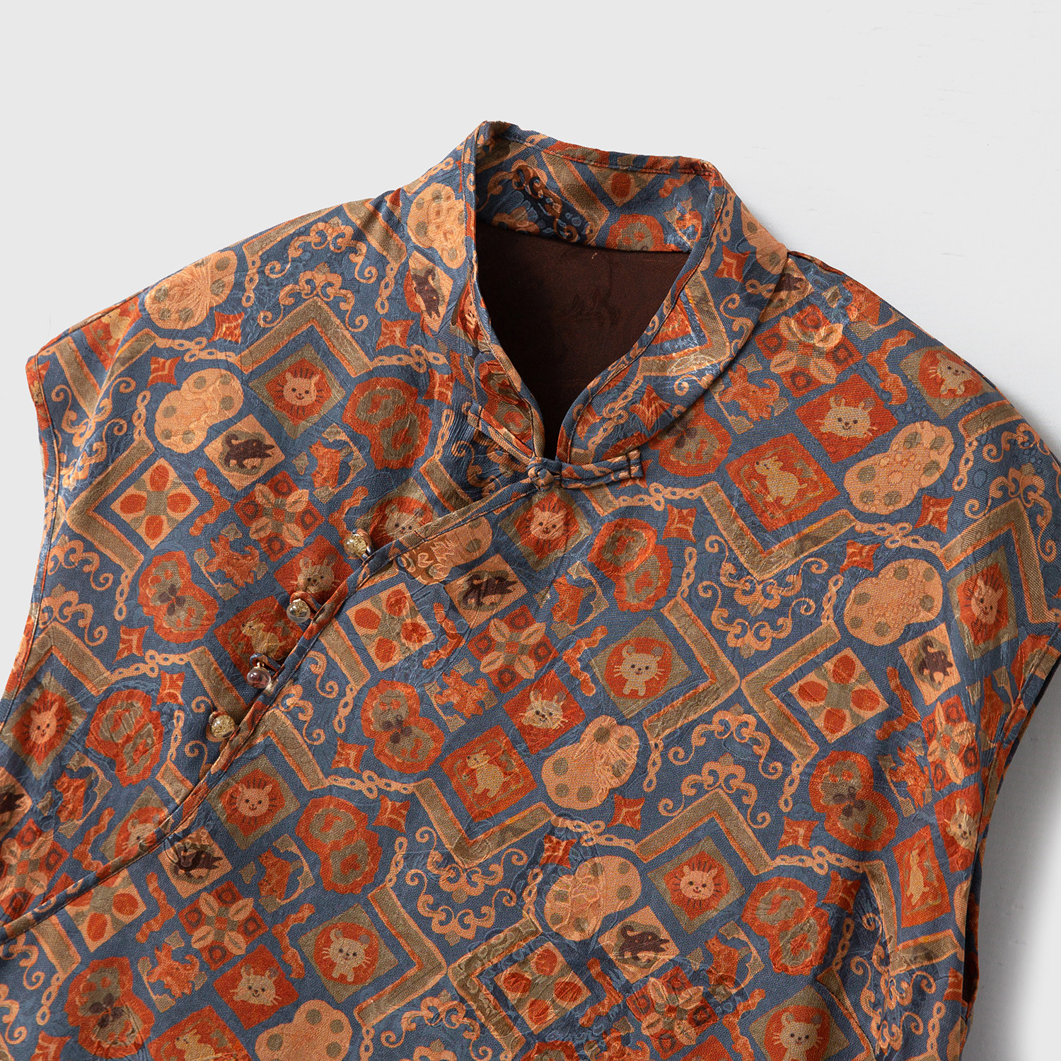 奥黛上衣女无袖 T恤背心 100%桑蚕丝真丝香云纱斜门襟盘扣长款 特惠