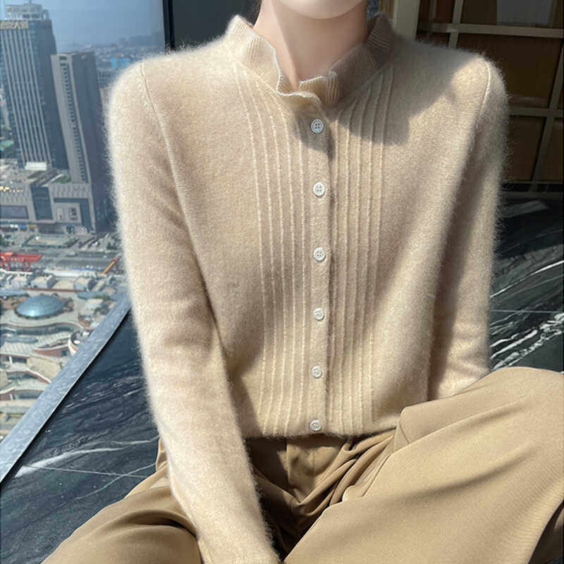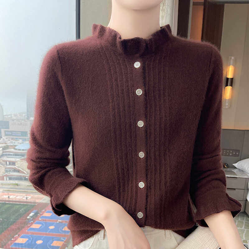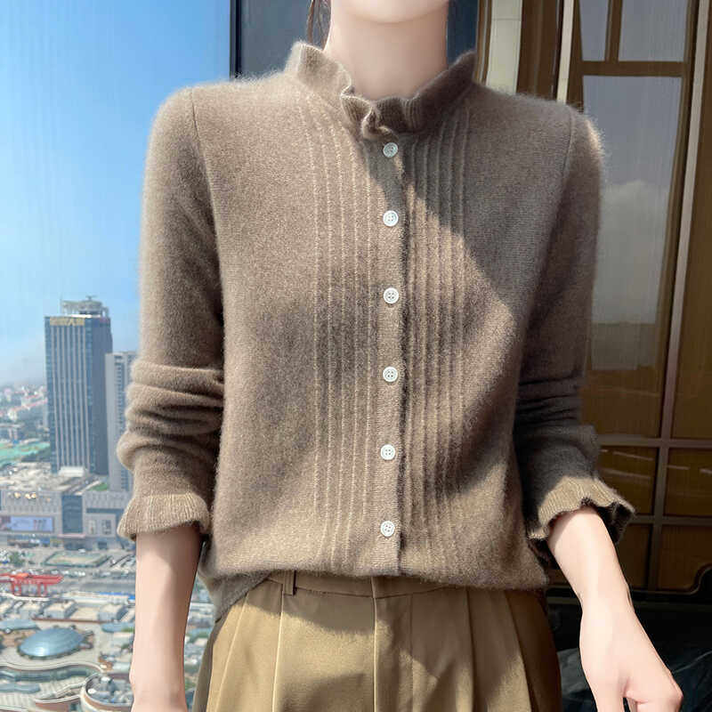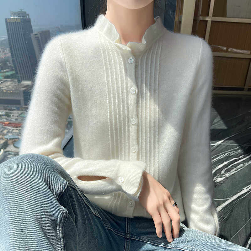 木耳边高级感山羊绒开衫 女半高领提花针织毛衣外套宽松甜美羊毛衫