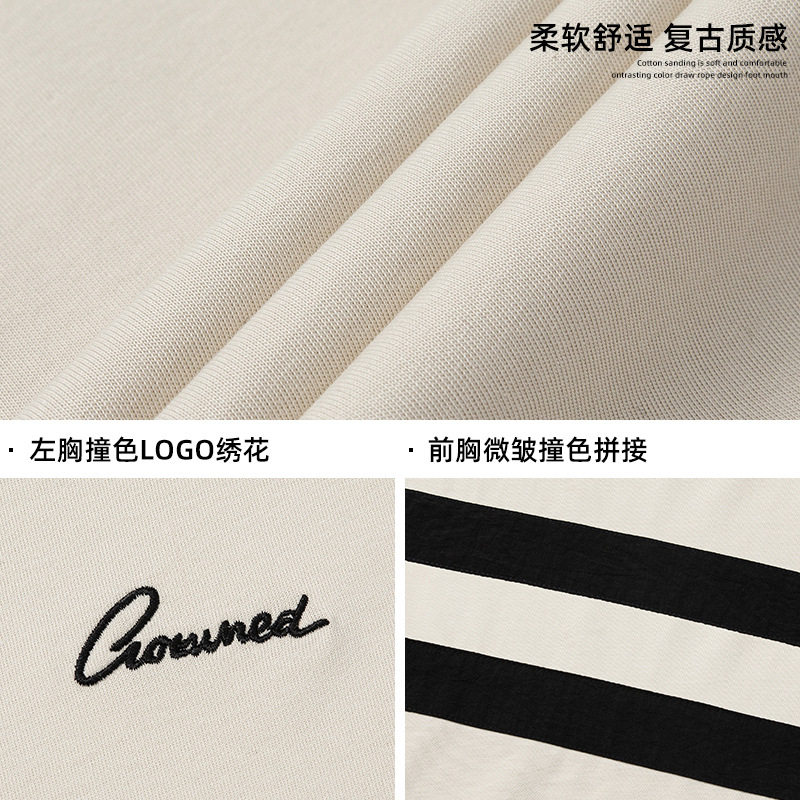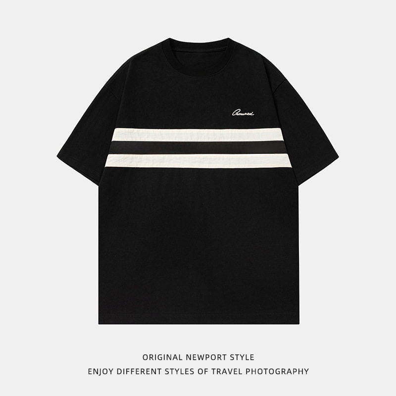 美式 复古刺绣宽松休闲短袖 T恤男夏季 新款 微皱条纹撞色设计体恤衫由