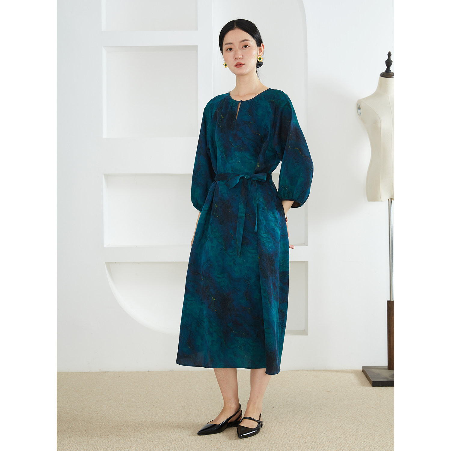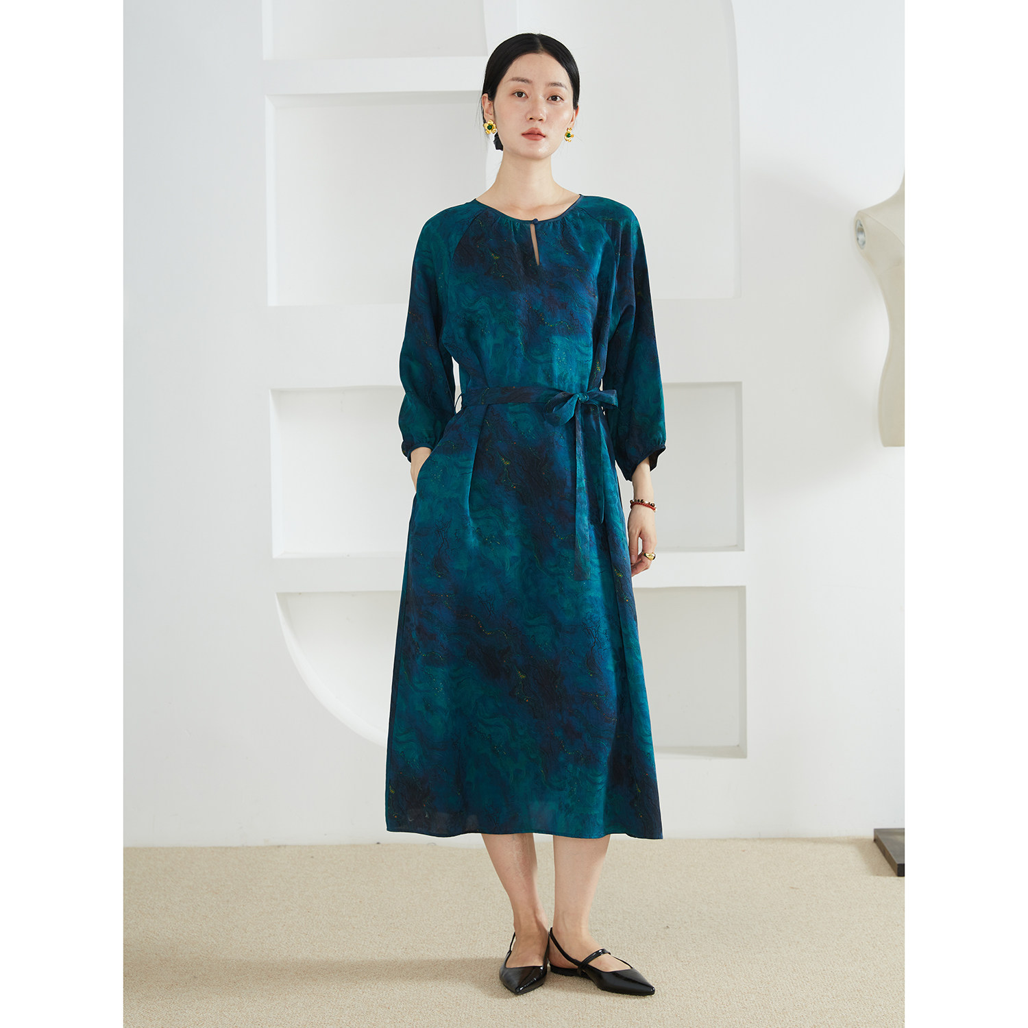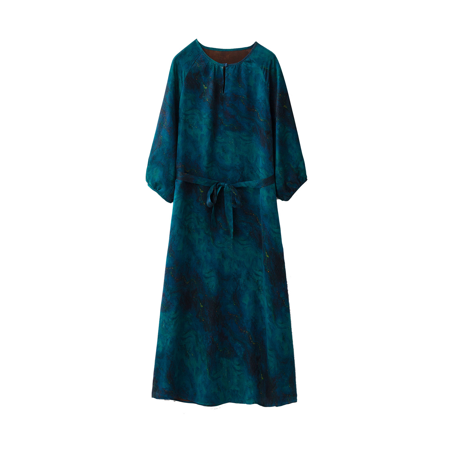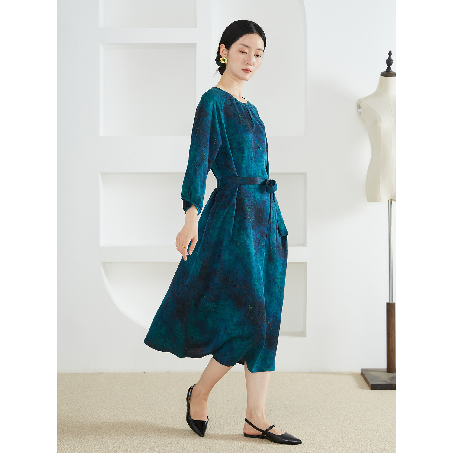 裙春 一丝牵香云纱提花花萝连衣裙女100%桑蚕丝真丝收腰深海蓝长袖由