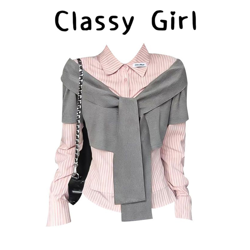 韩系真两件衬衫 女早春miu系粉色衬衣学院风修身 上衣 粉灰撞色