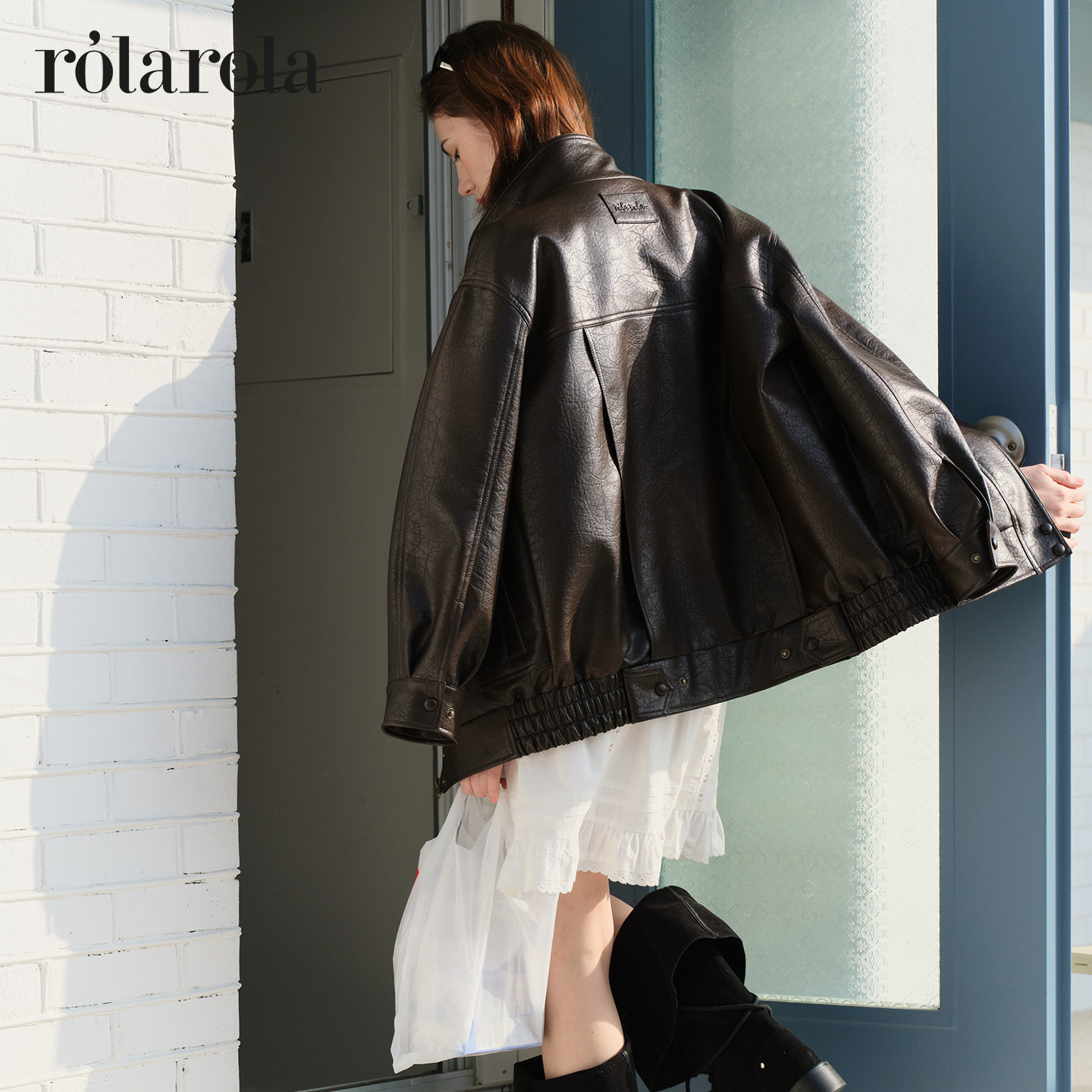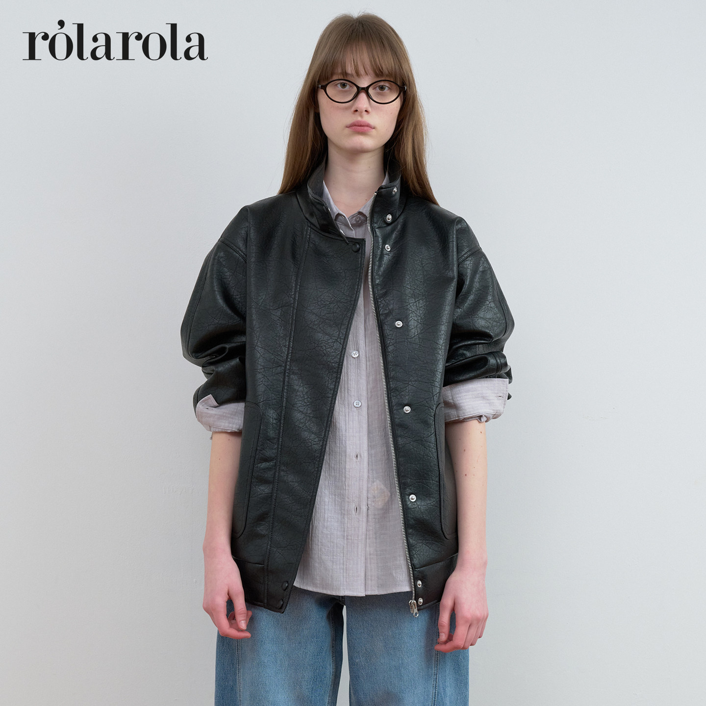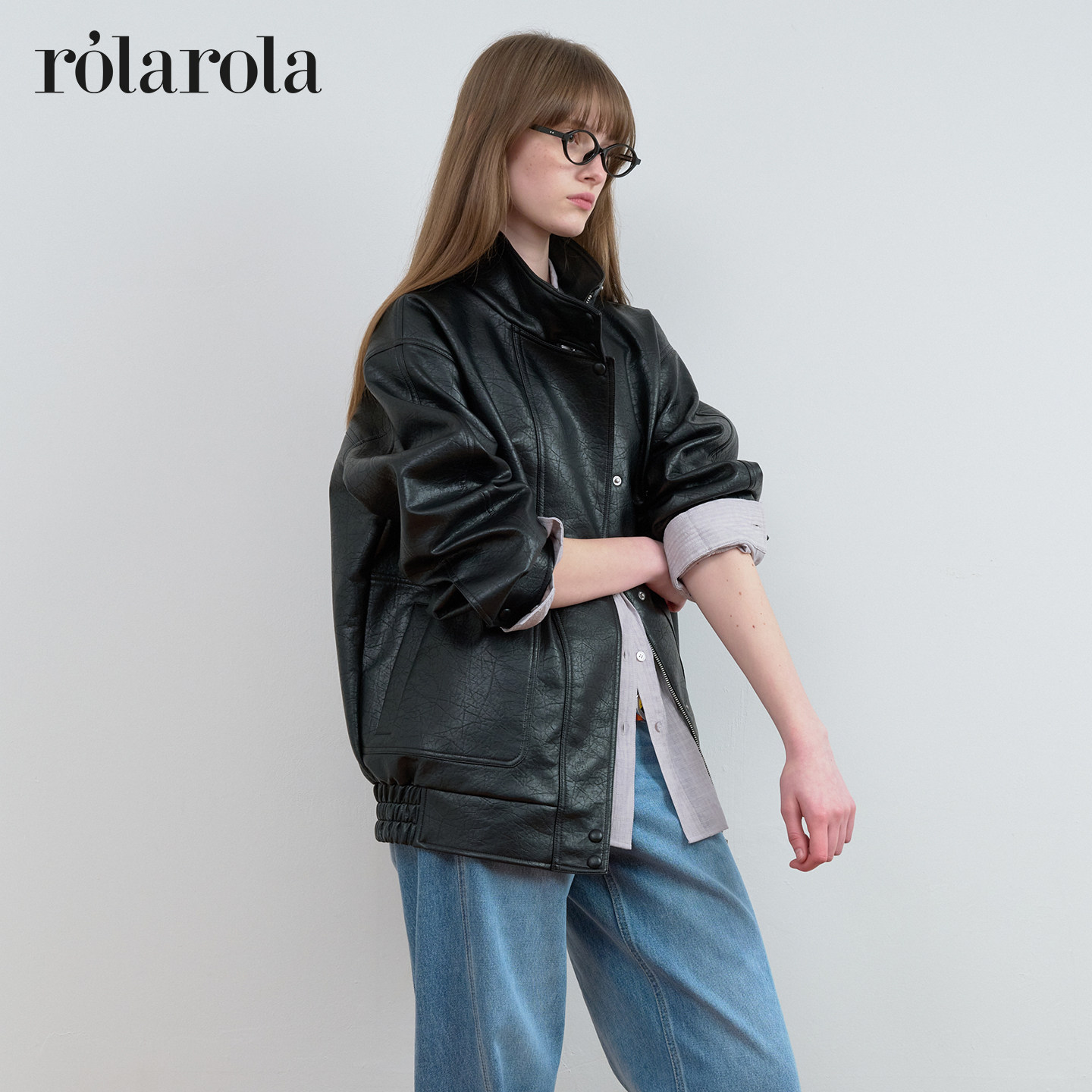 英同款 rolarola26年春季 新立领人造皮衣廓形夹克机车风外套 张元