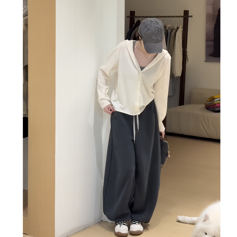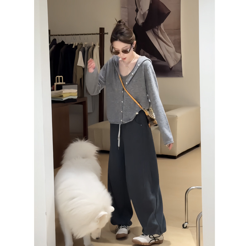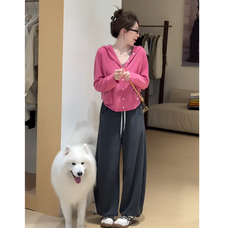 巨好看 外套百搭休闲裤 套装 女 两件套早春韩系慵懒风连帽针织开衫