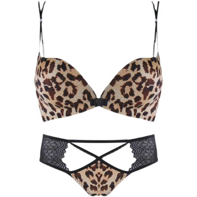 维多利亚性感前扣豹纹内衣女小胸聚拢无钢圈情趣美背无痕文胸套装