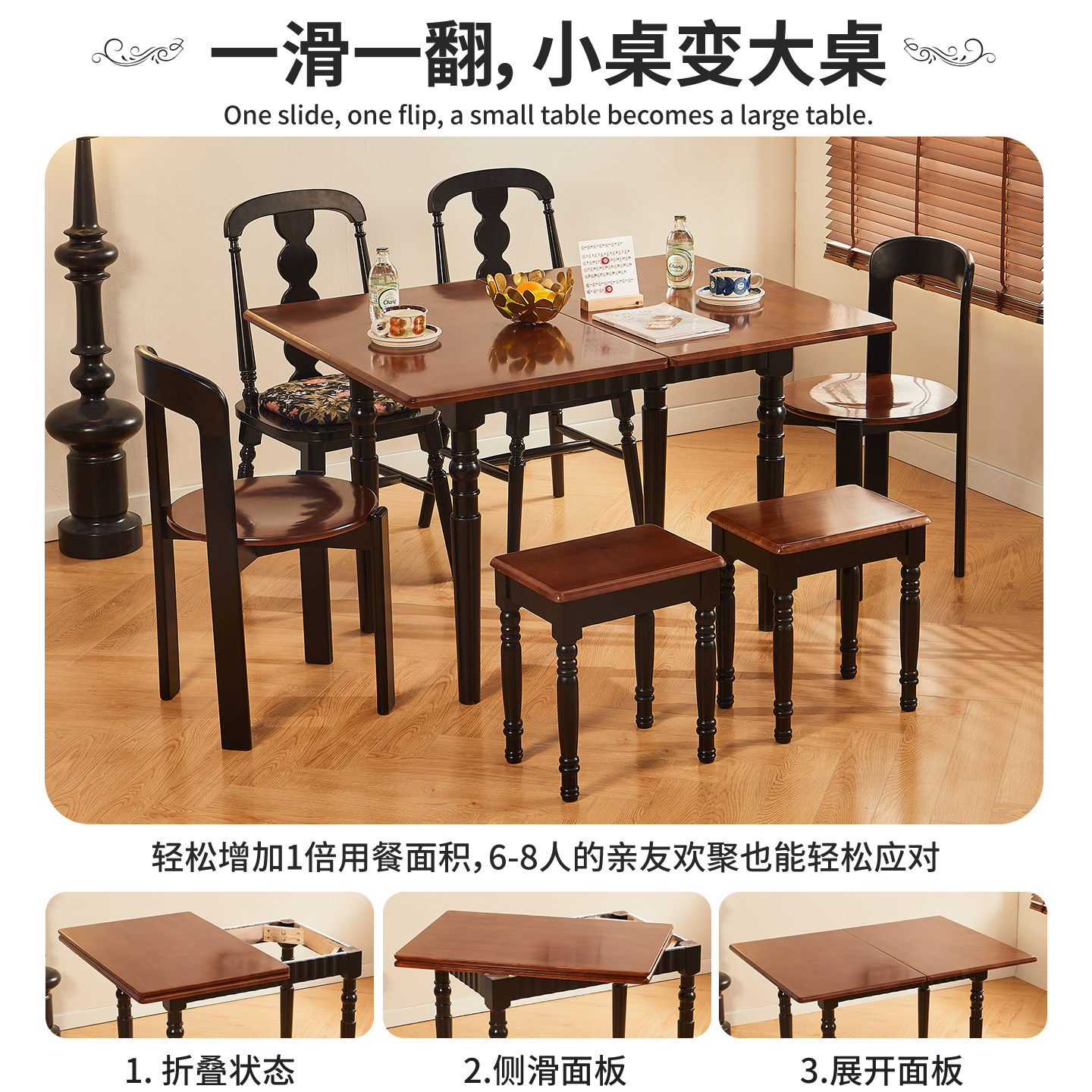 为您提供商品复古实木饭桌子靠墙伸缩餐桌椅组合 中古风小户型折叠餐桌家用法式的详细介绍,