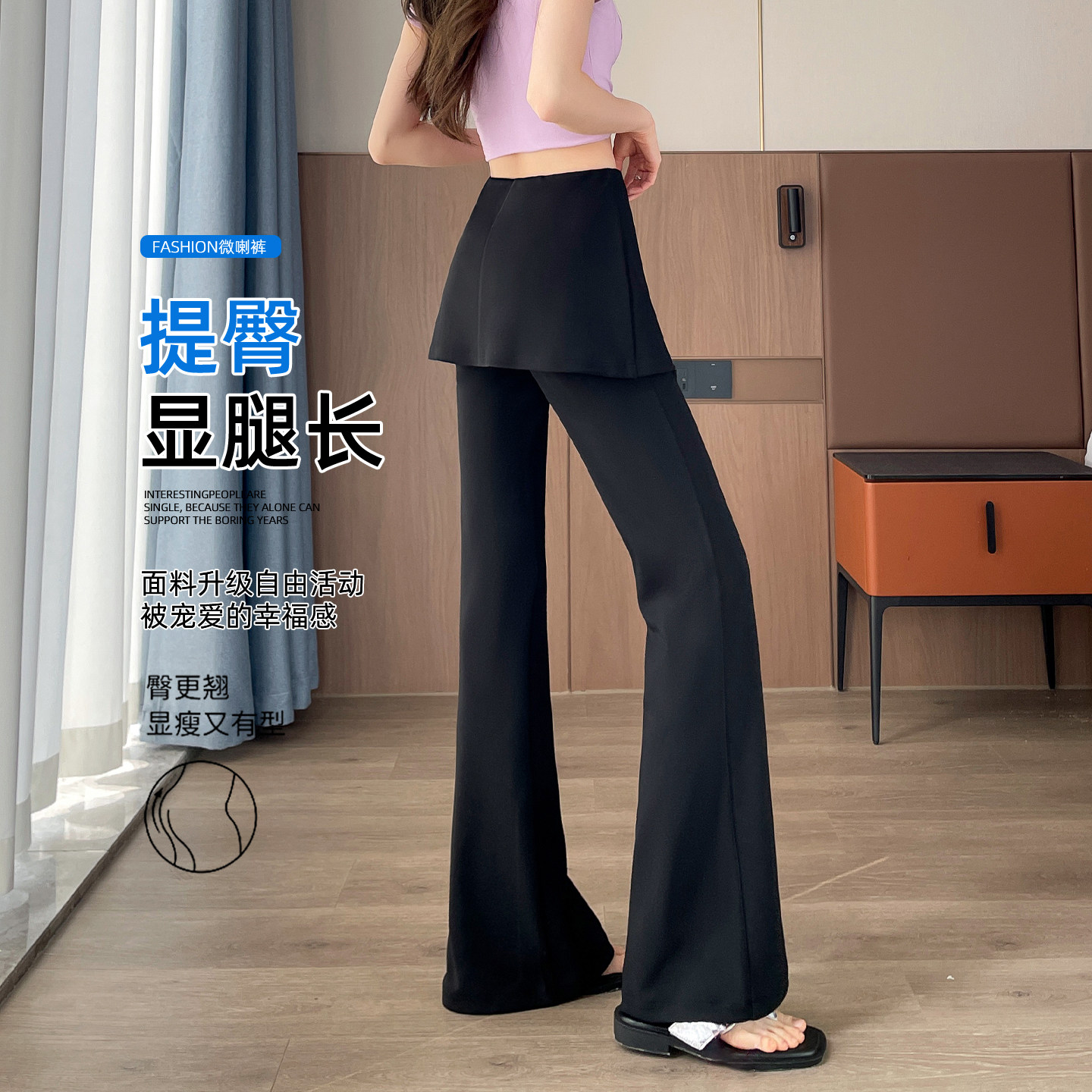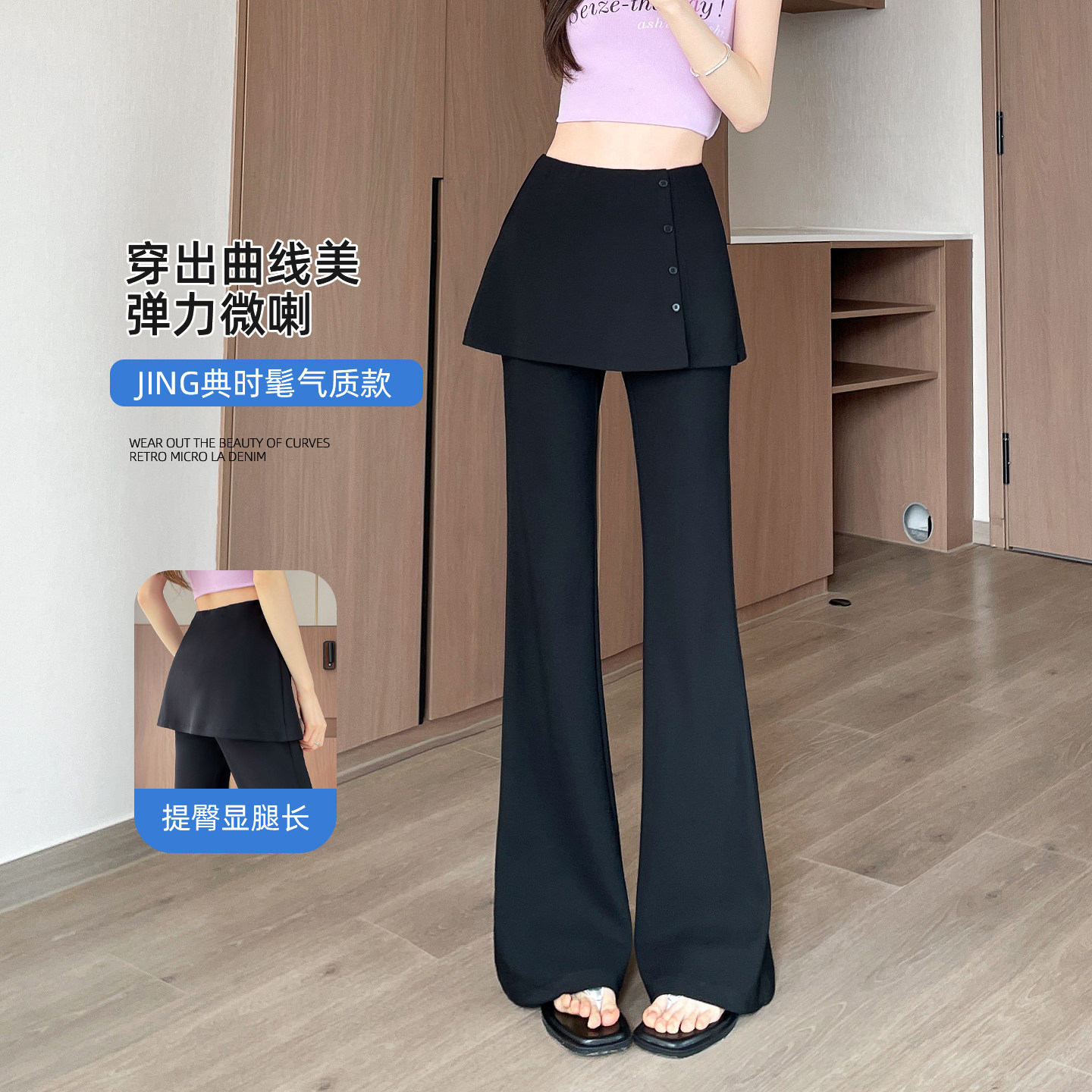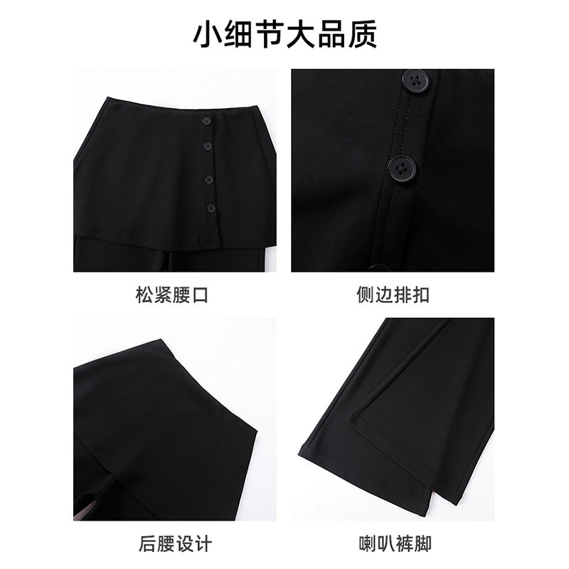 为您提供商品高腰修身 假两件屁帘微喇裤 女2026春季 新款 显瘦垂感休闲马蹄喇叭裤的详细介绍,