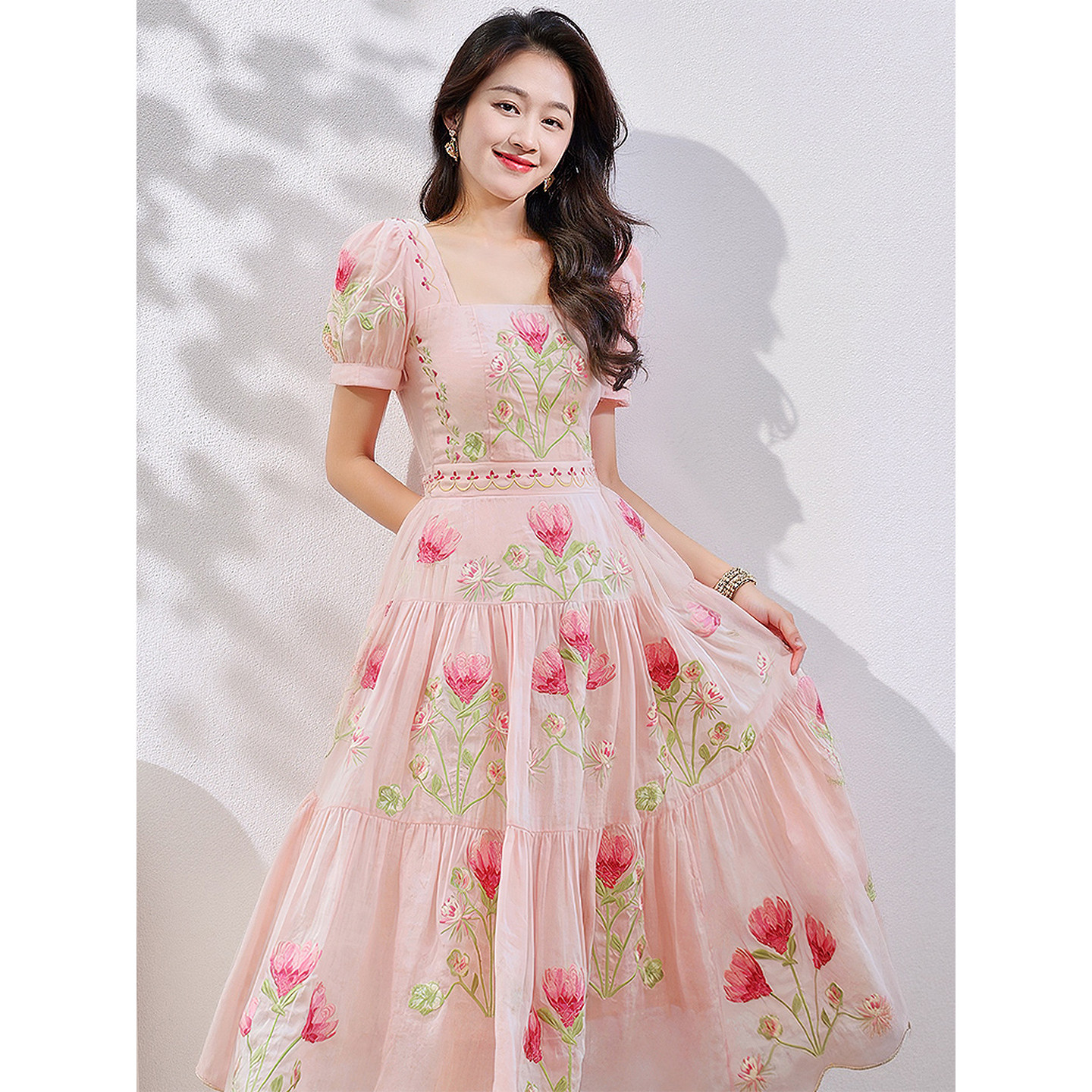 法式 方领收腰中长裙气质显瘦夏季 碎花短袖 重工刺绣连衣裙女泡泡袖