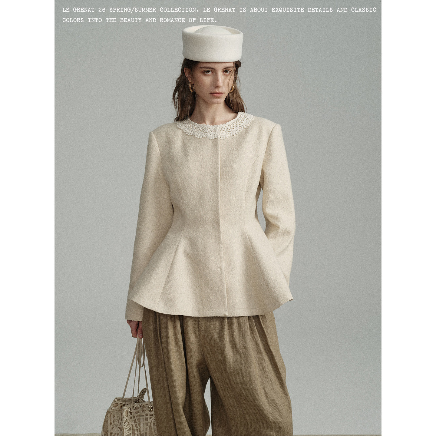 饰圆领收腰A摆长袖 短款 外套 Grenat春夏女设计感手工钩针蕾丝装