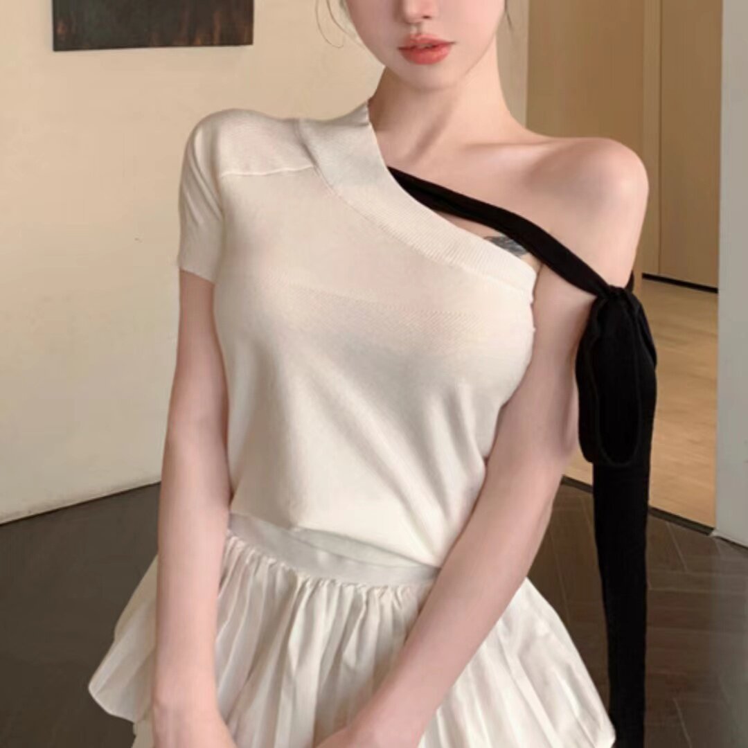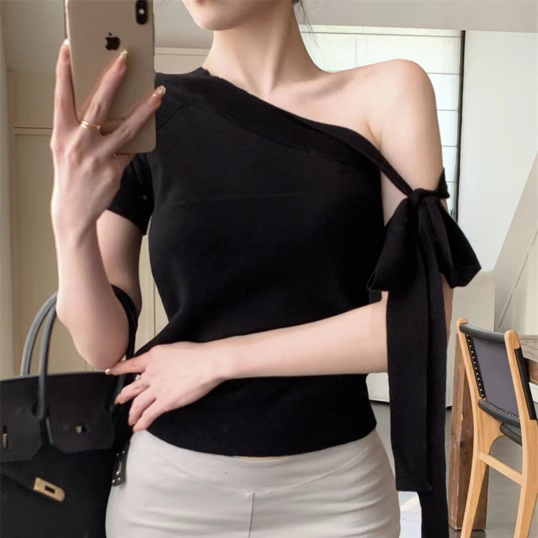 加小码 女装 显高150cmXXXS小个子纯欲风蝴蝶结斜肩短袖 T恤性感 夏装
