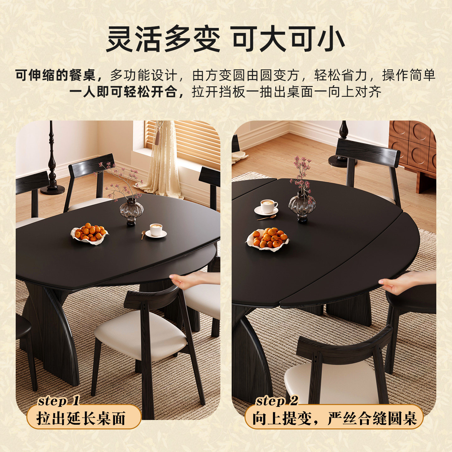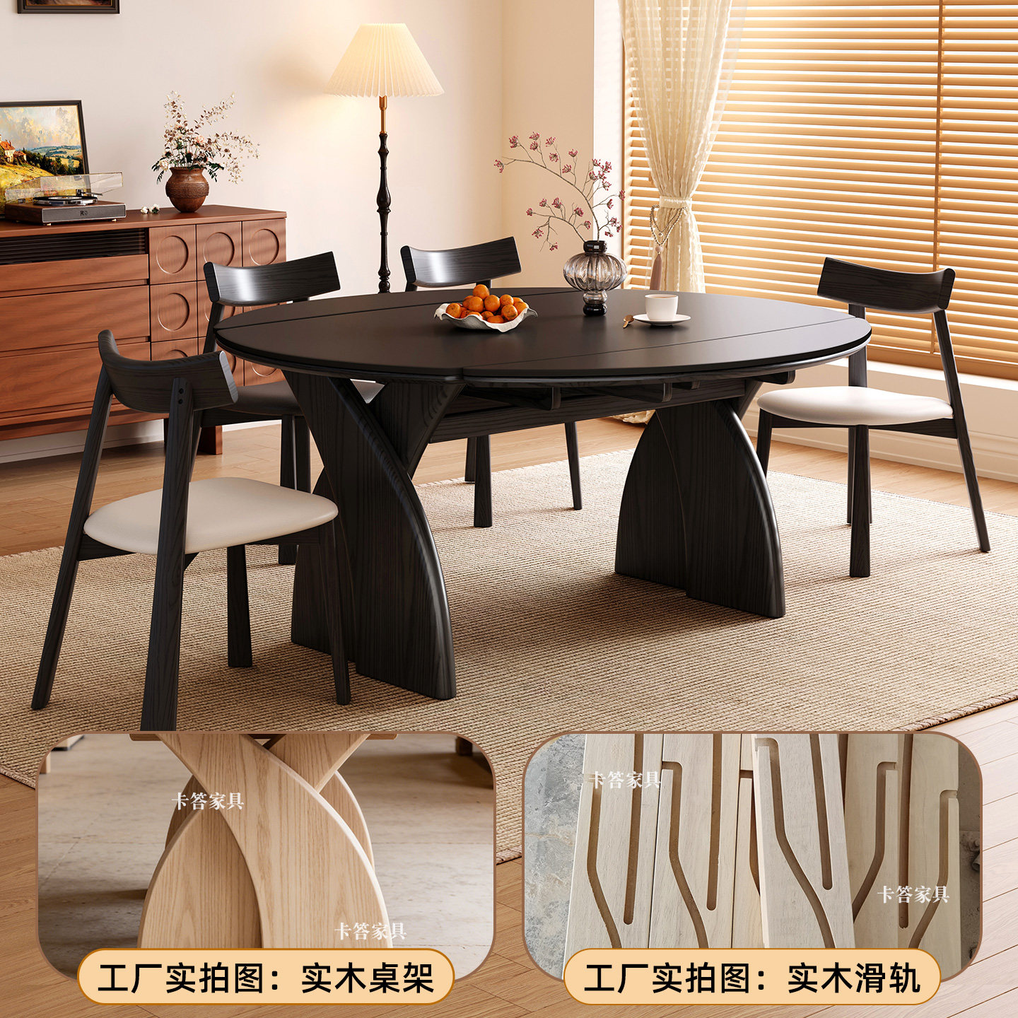 为您提供商品中古饭桌 黑色复古风实木岩板伸缩餐桌可变圆桌家用小户型折叠美式的详细介绍,
