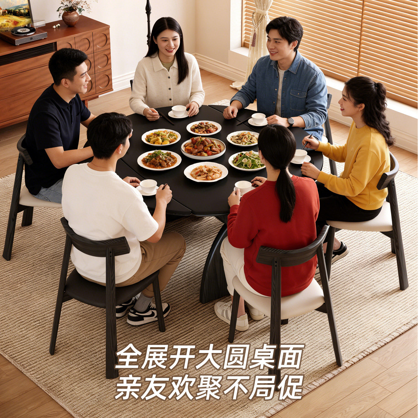 全友家居北欧岩板餐桌可变圆桌客厅家用小户型可伸缩折叠餐桌椅