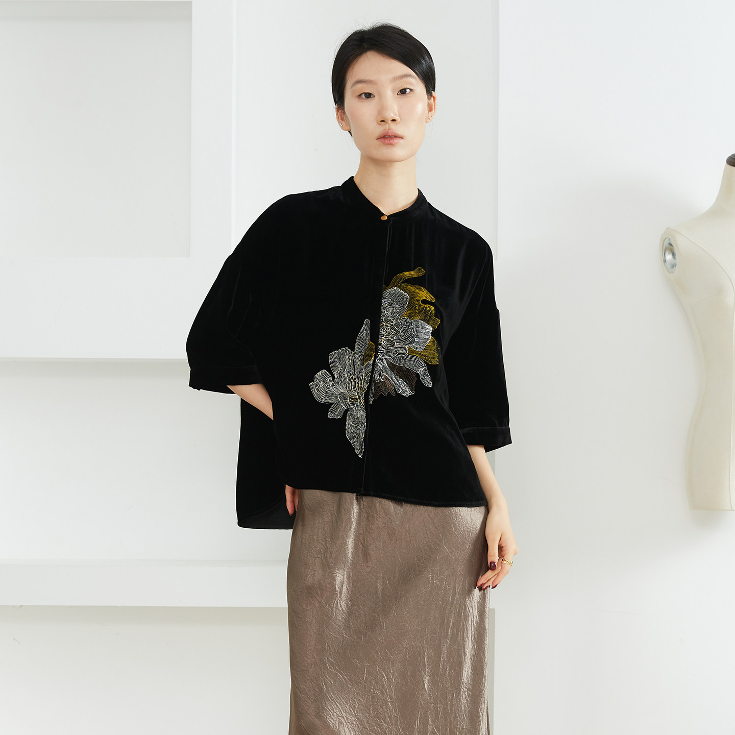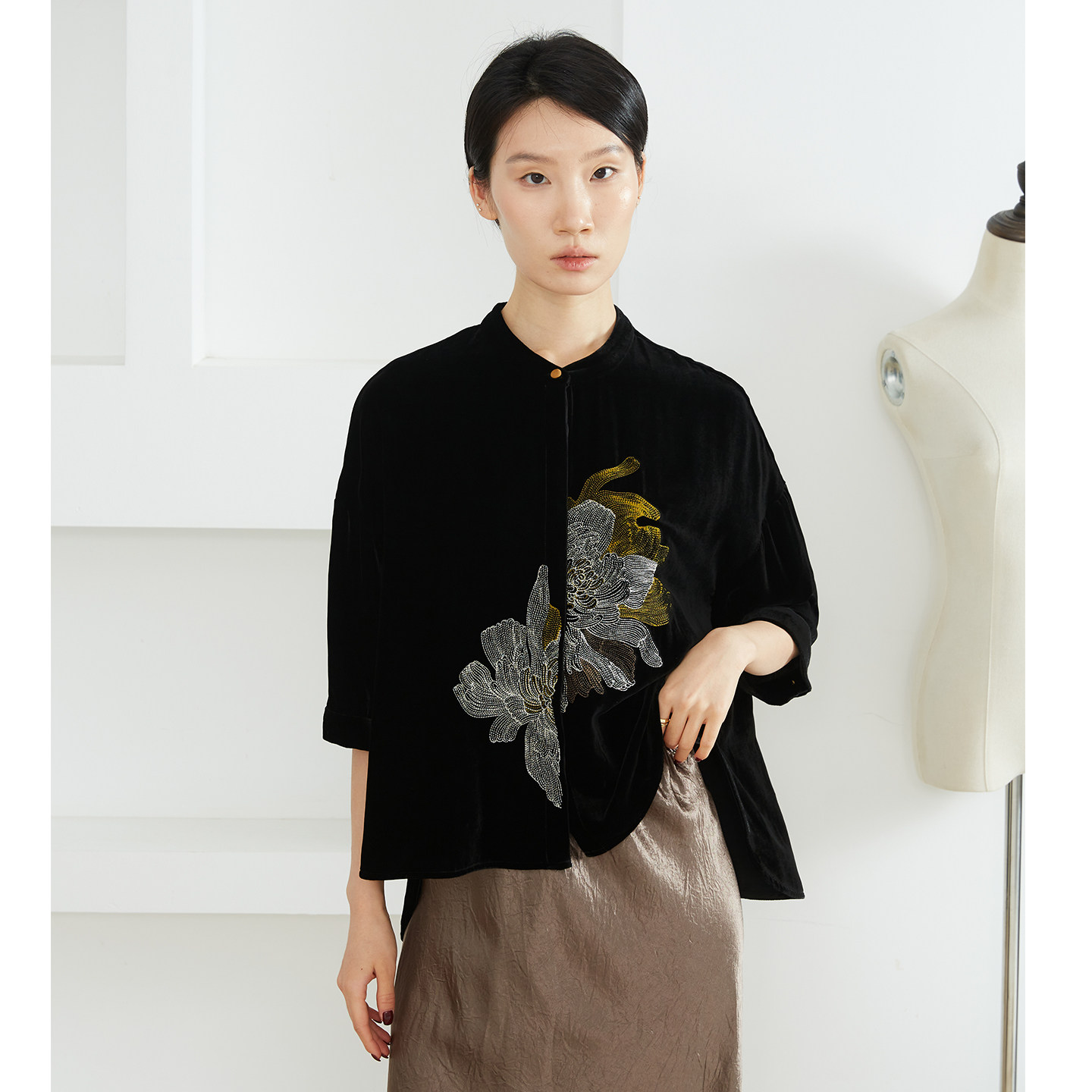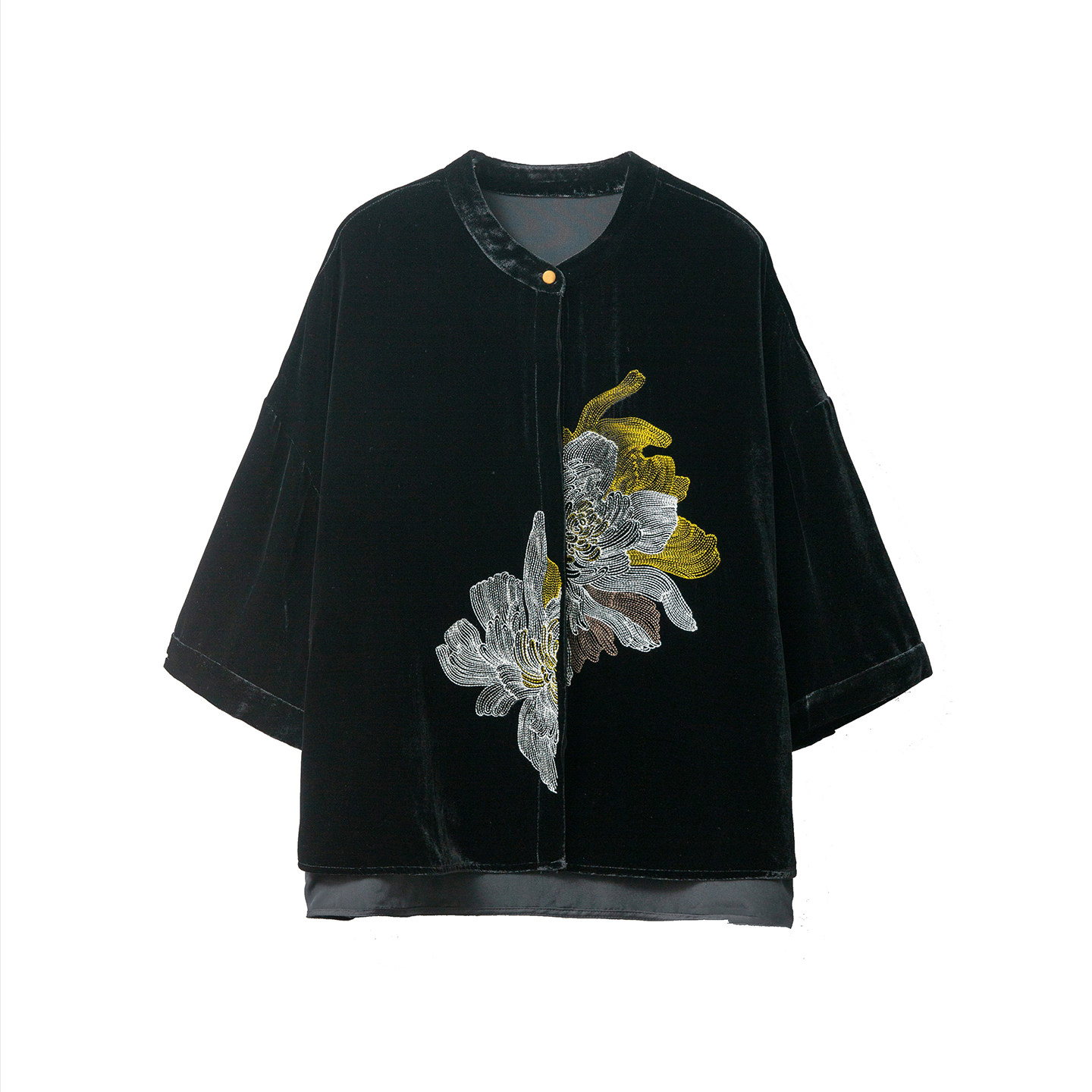 落肩袖 100%桑蚕丝底布重工织金刺绣真丝丝绒外套宽松衬衫 一丝牵