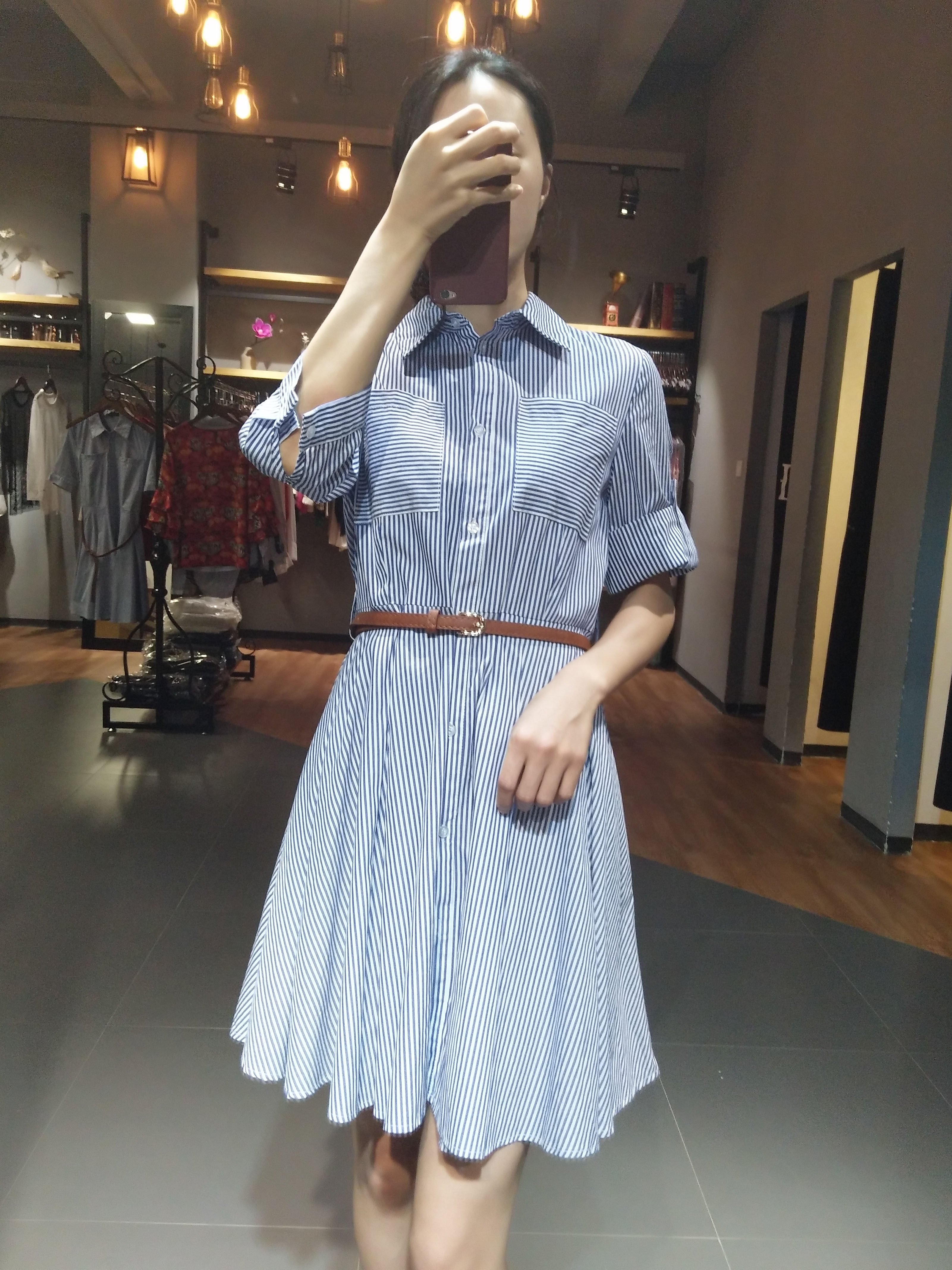 显瘦中长款 2017欧洲站春夏季 新款 细条纹收腰衬衫 连衣裙女 中袖由