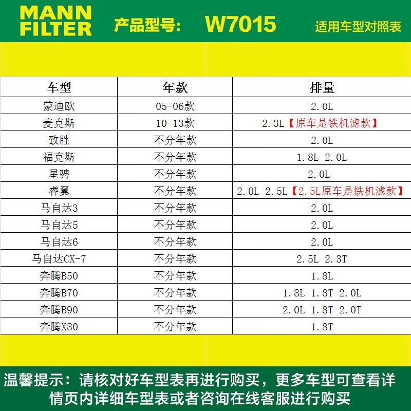 为您提供商品机油滤适用福克斯蒙迪欧奔腾B50马自达356 曼牌W7015M被W7152替代的详细介绍,