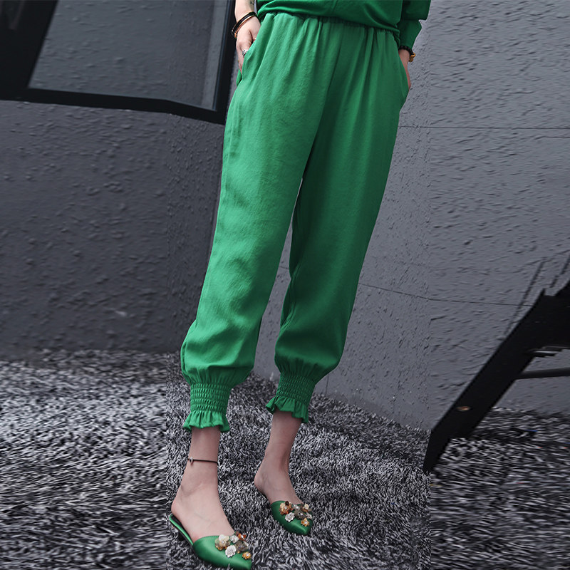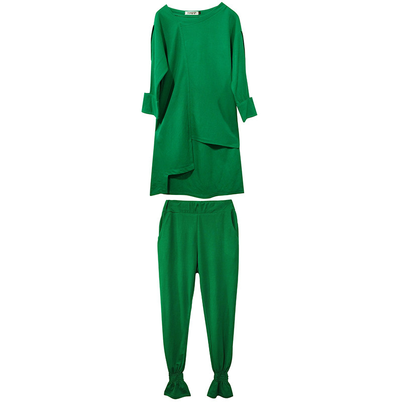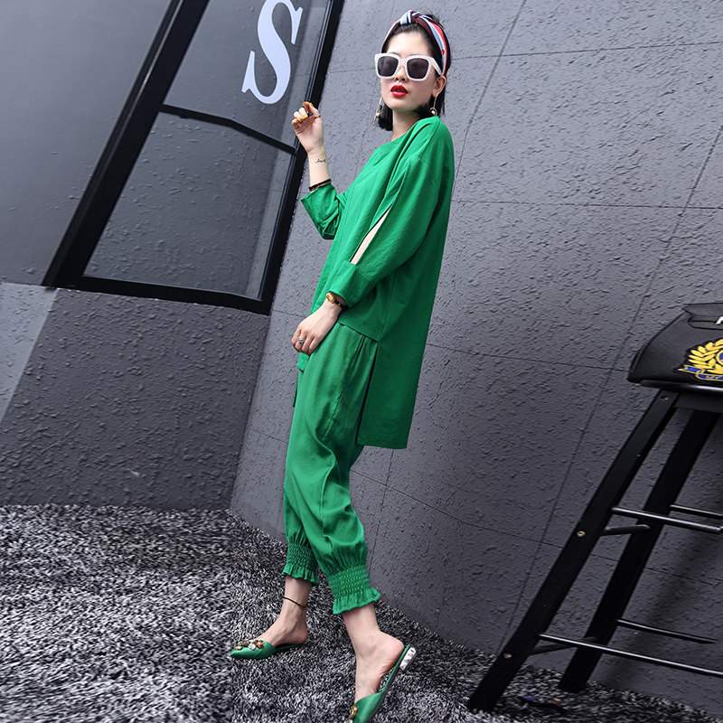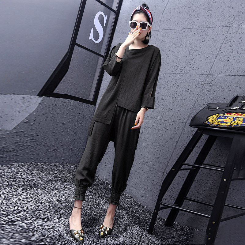 显瘦露胳膊袖 女韩版 套装 两件套冰麻 灯笼裤 2021夏季 不规则大衫 时尚
