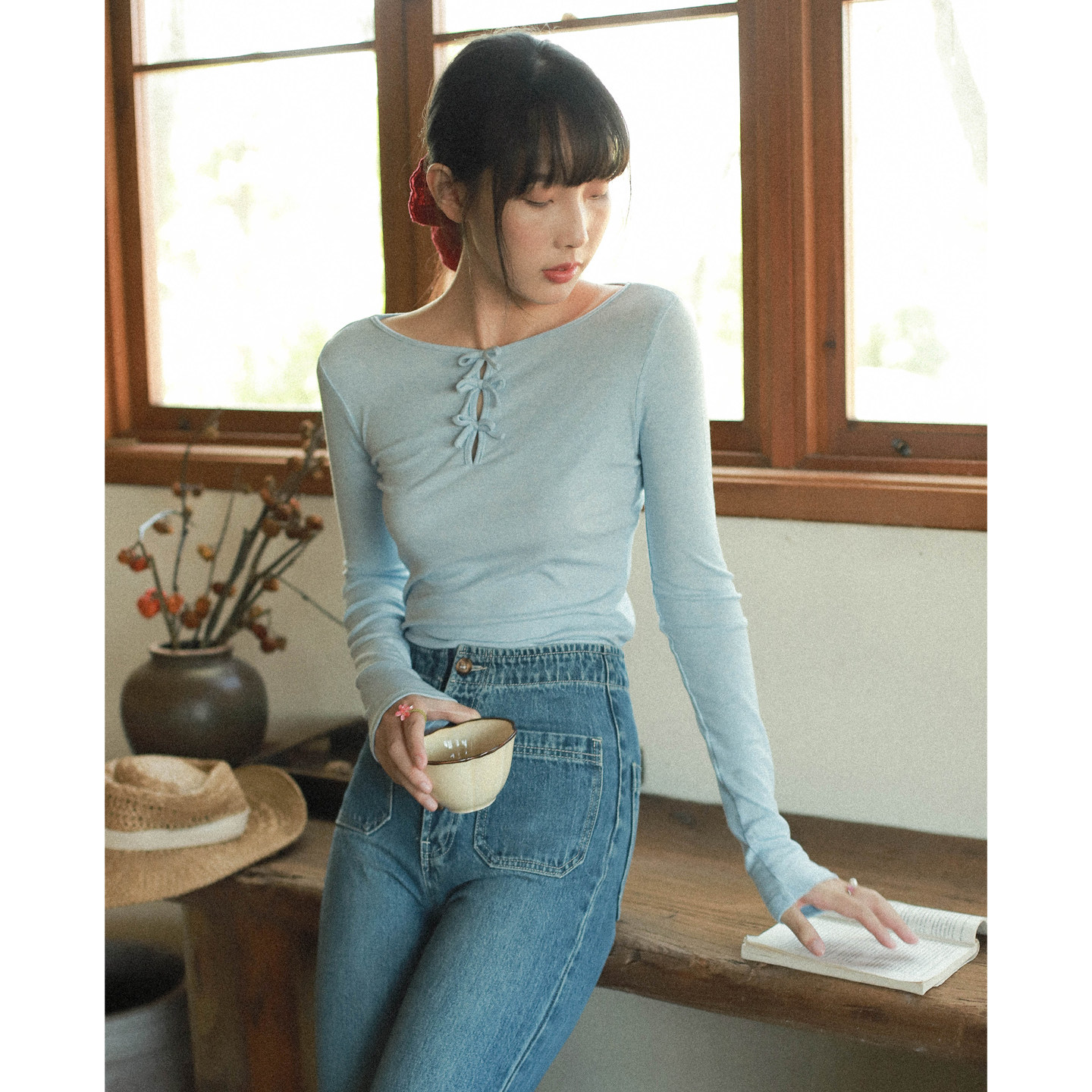 otherbela早秋新品 针织上衣 减龄清新蝴蝶结羊毛亲肤混色打底长袖