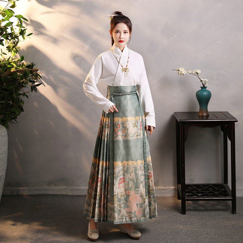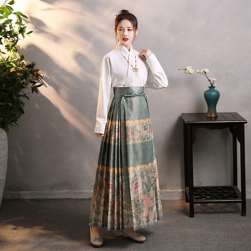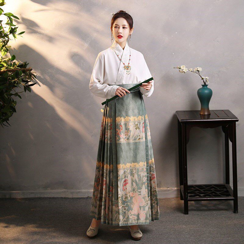 古装 改良日常穿搭 女大童上衣国风成人款 明制汉服女绿色马面裙套装