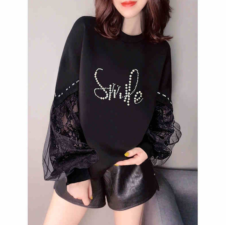 女装 设计感网纱拼接时尚 印花短款 黑色卫衣欧洲站2021春季 新款