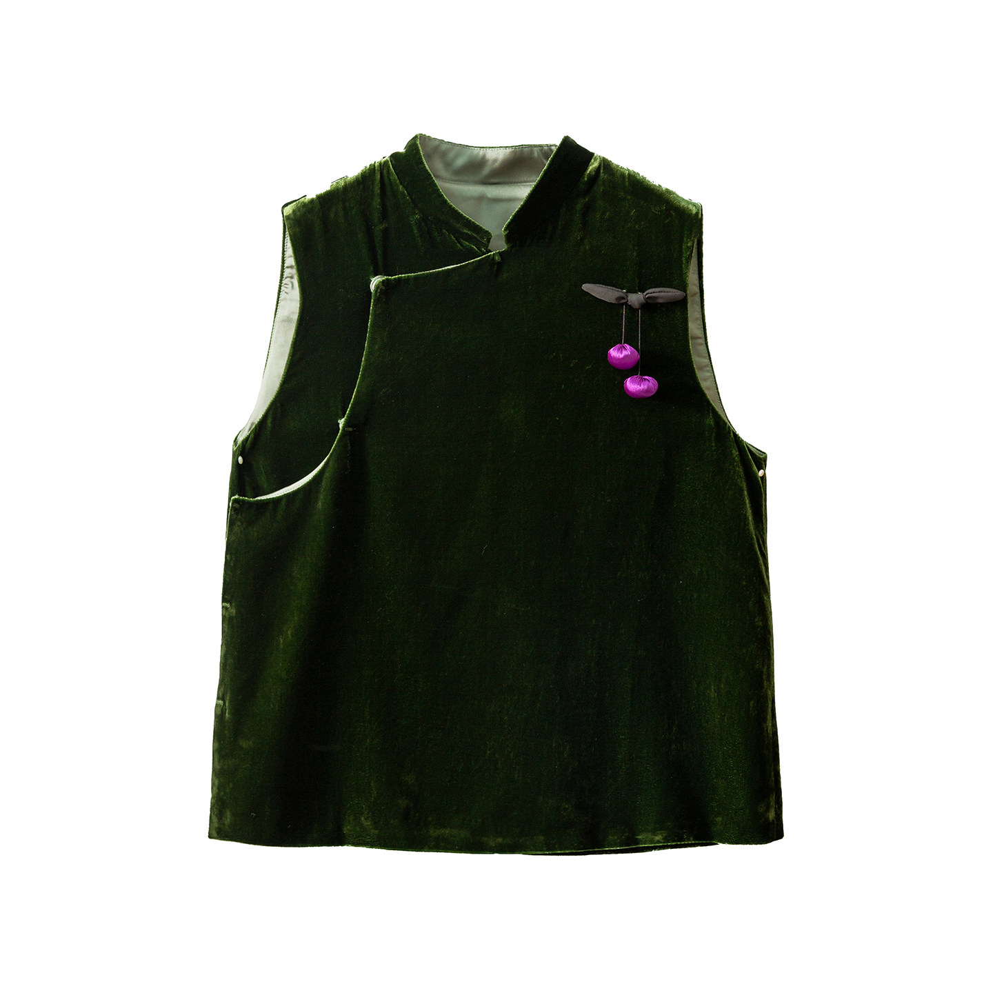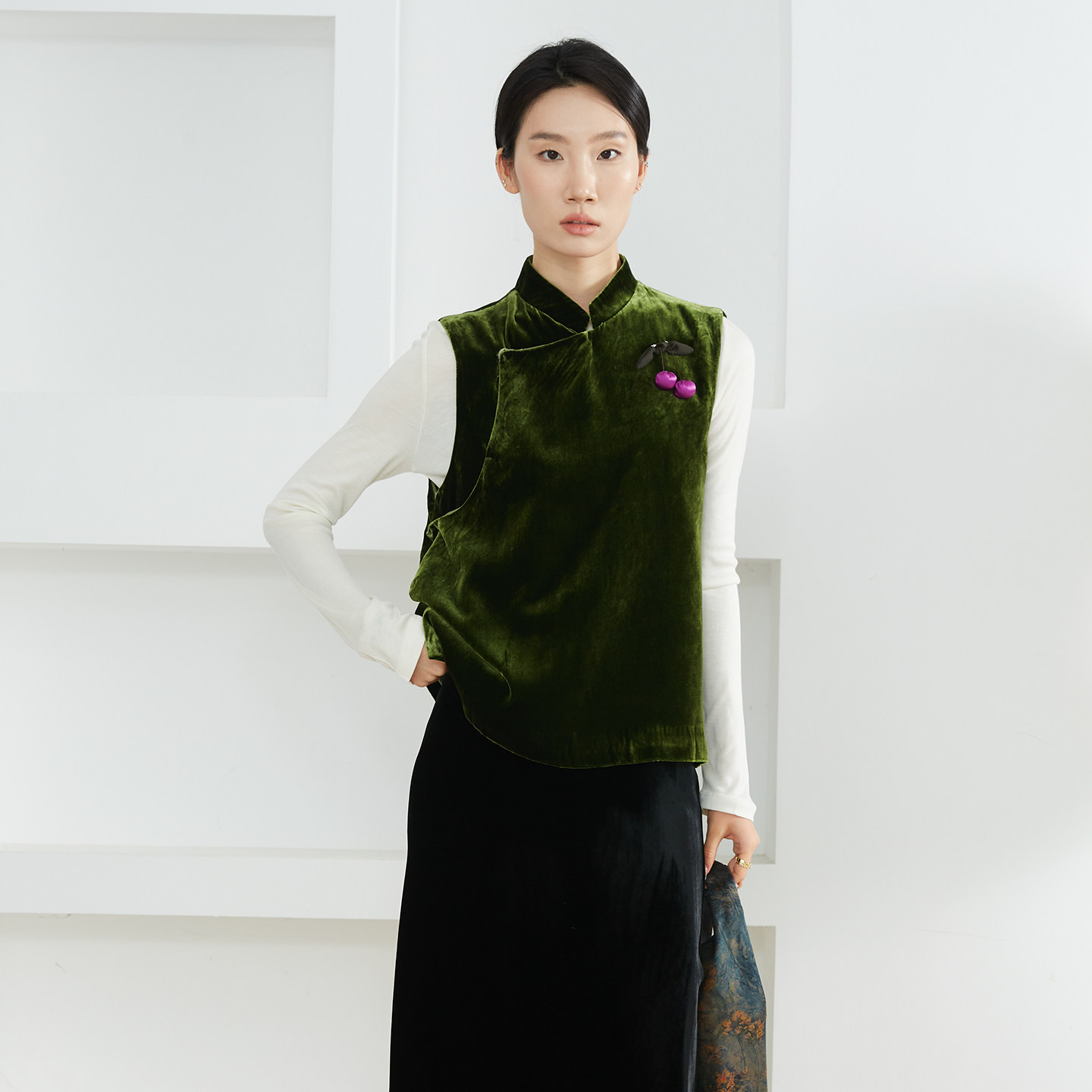 特惠 马夹上衣春 丝绒立领斜门襟暗扣真丝国风马甲女桑蚕丝新中式由