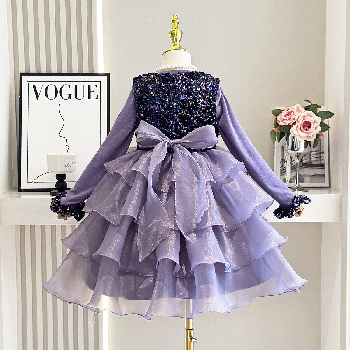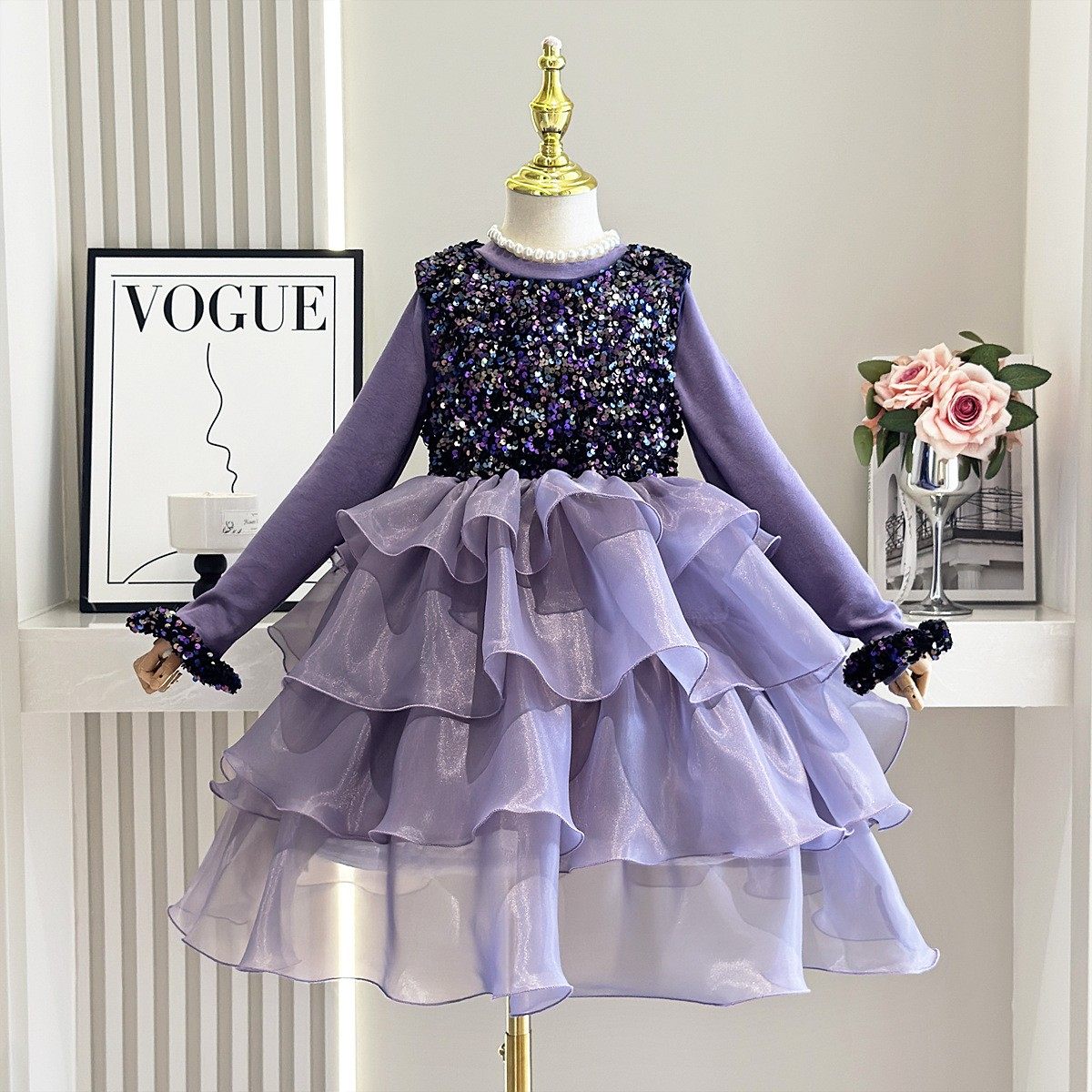 女童蛋糕裙礼服洋气女宝宝亮片紫色两件套蓬蓬连衣裙 2025秋冬新款