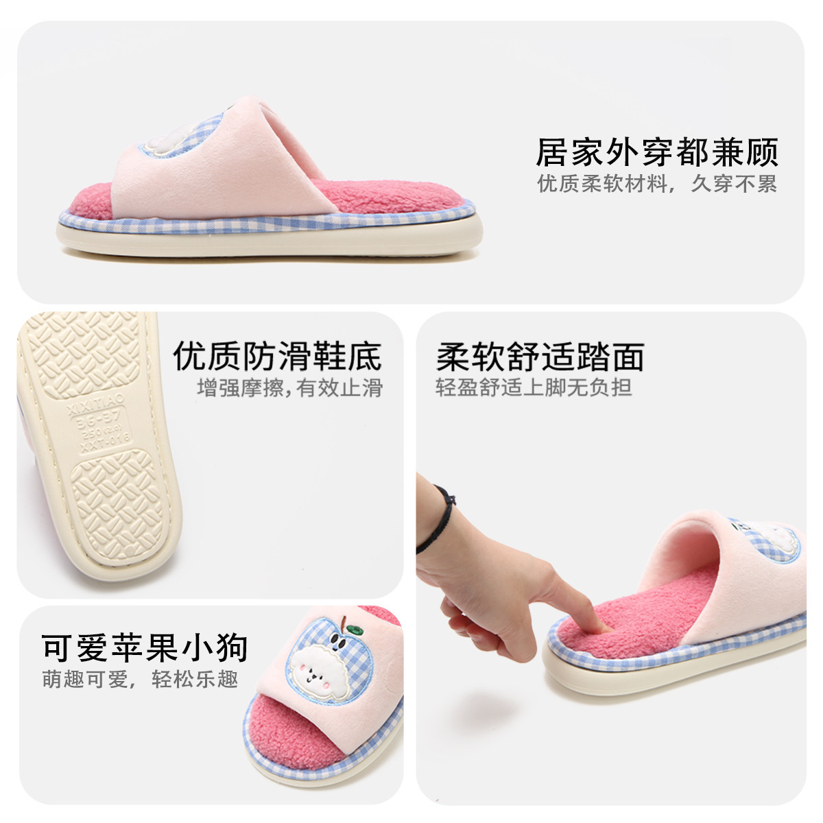 为您提供商品秋冬少女心防滑卧室一字棉拖鞋 可爱ins苹果小狗毛绒居家鞋 细细条的详细介绍,
