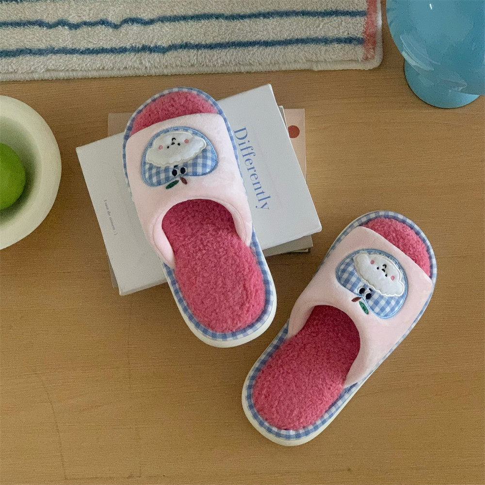 秋冬少女心防滑卧室一字棉拖鞋 可爱ins苹果小狗毛绒居家鞋 细细条
