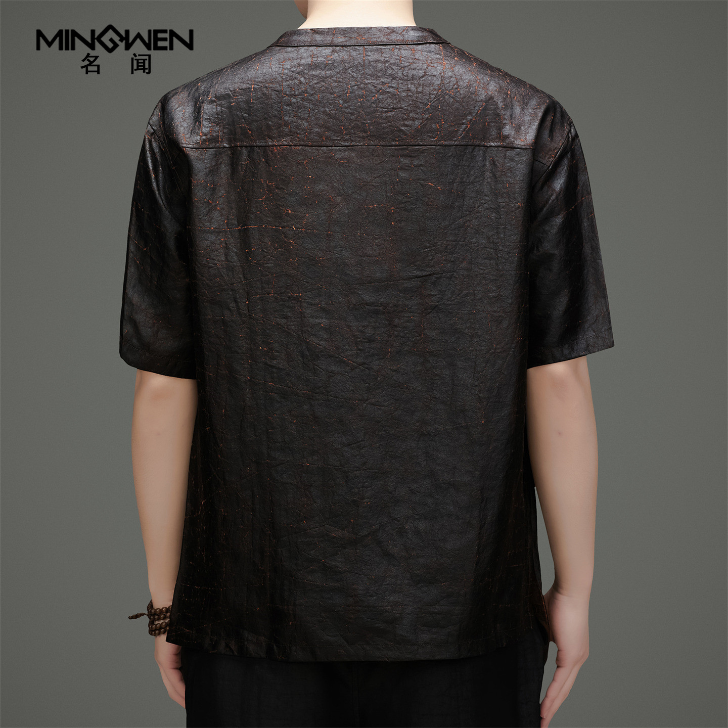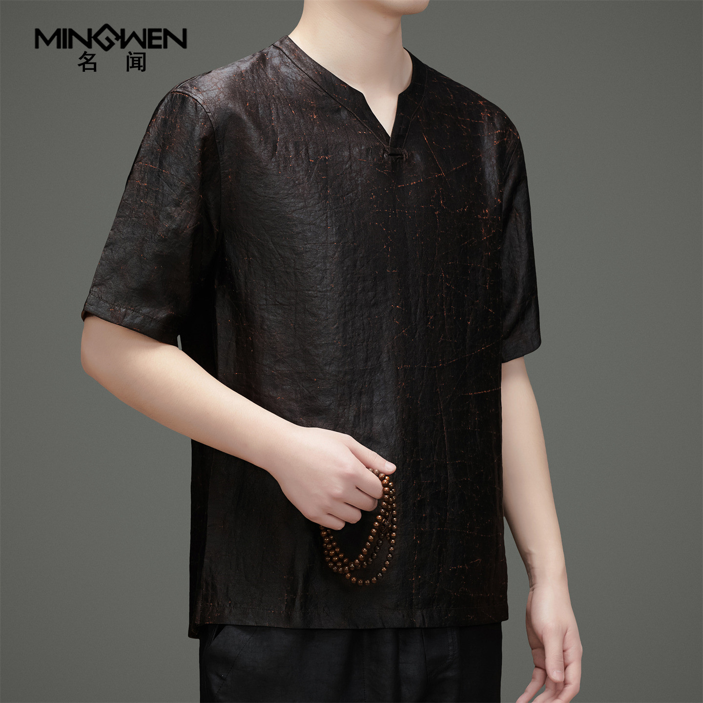 龟裂纹香云纱真丝圆领短袖 新中式 国风桑蚕丝半袖 上衣 t恤男夏薄款