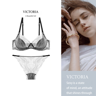 防下垂情趣文胸套装 维多利亚内衣女大胸显小胸蕾丝性感超薄款 正品由