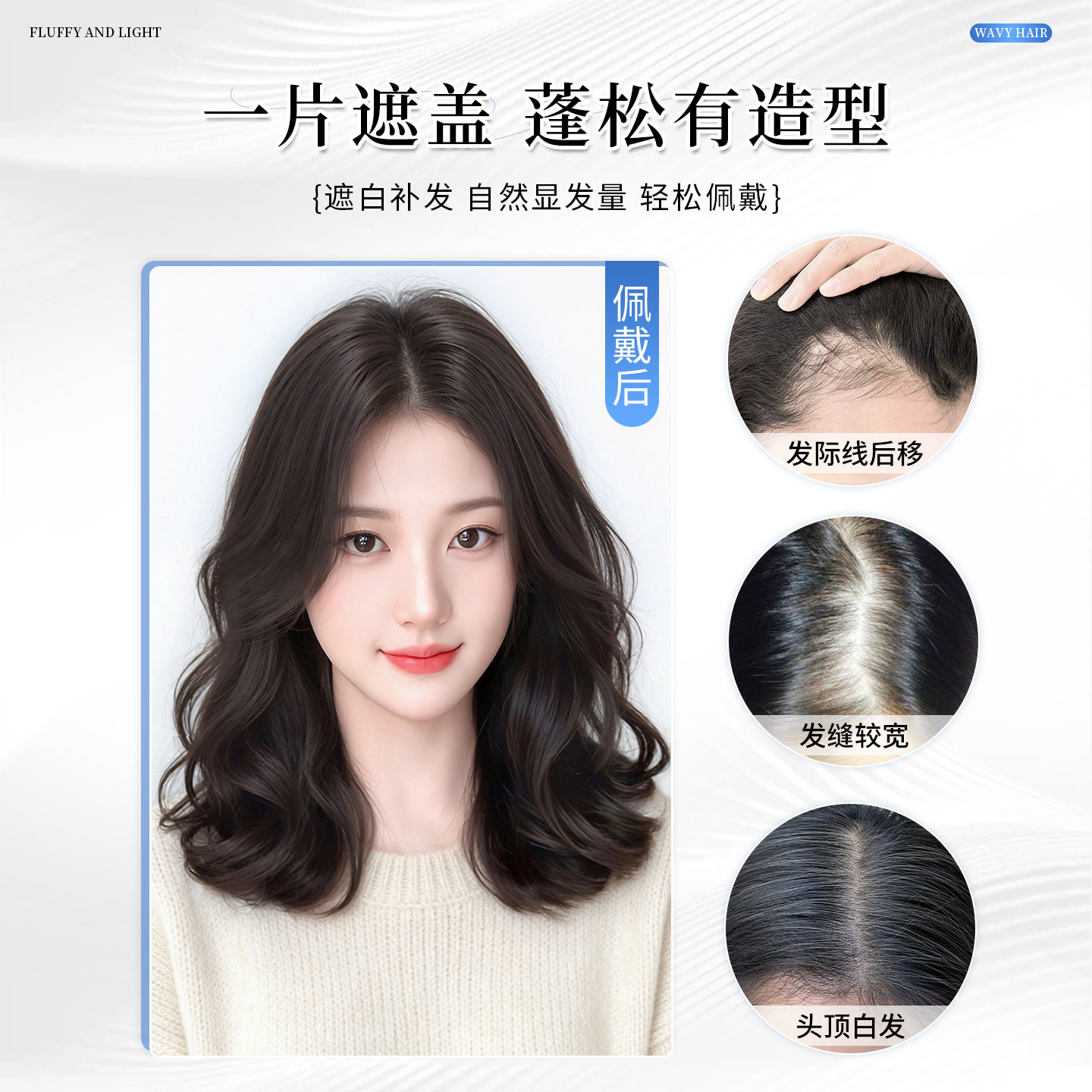 为您提供商品不用戴发网假发女片头顶蓬松仿真发增发遮白发短发无痕微卷补发片的详细介绍,