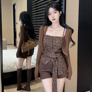 时尚 大码 胖MM美式 复古豹纹绑带吊带背心气质显瘦防晒针织开衫 套装