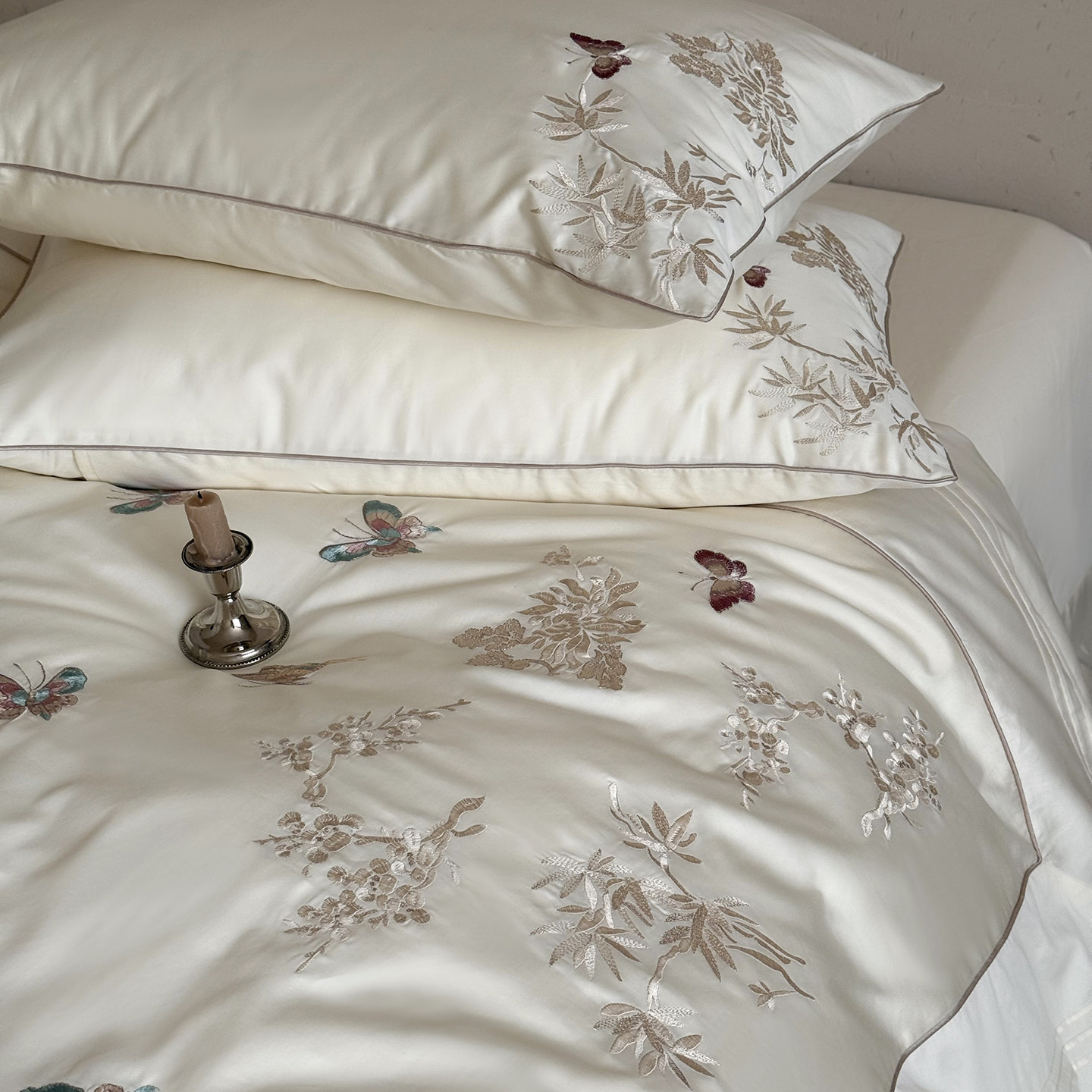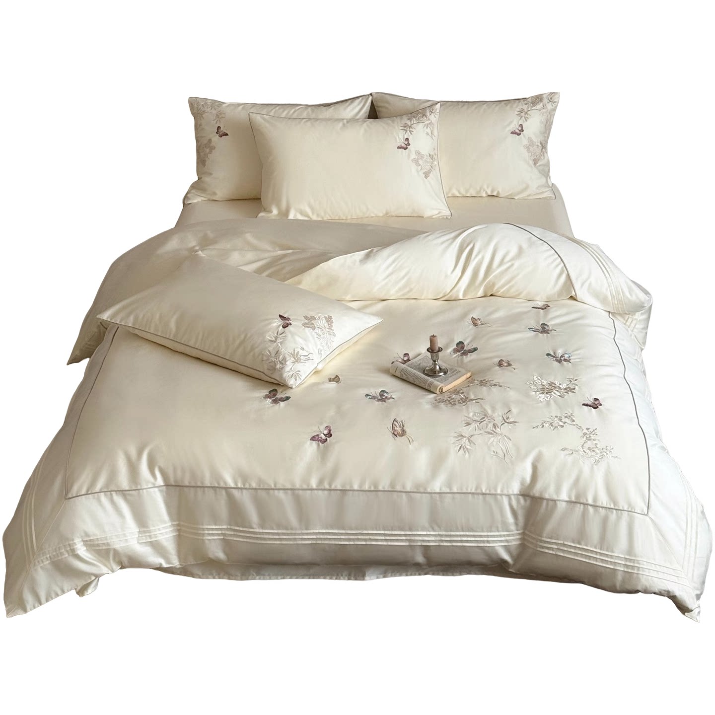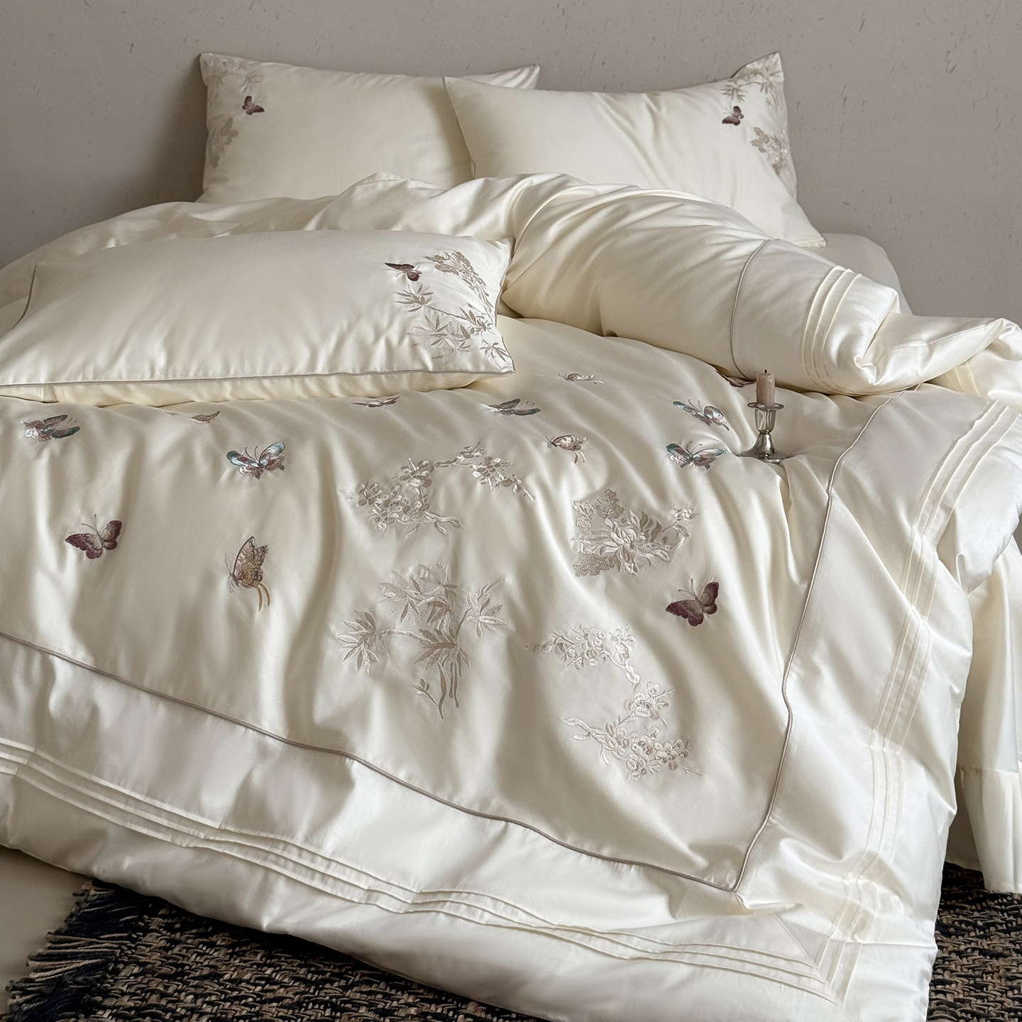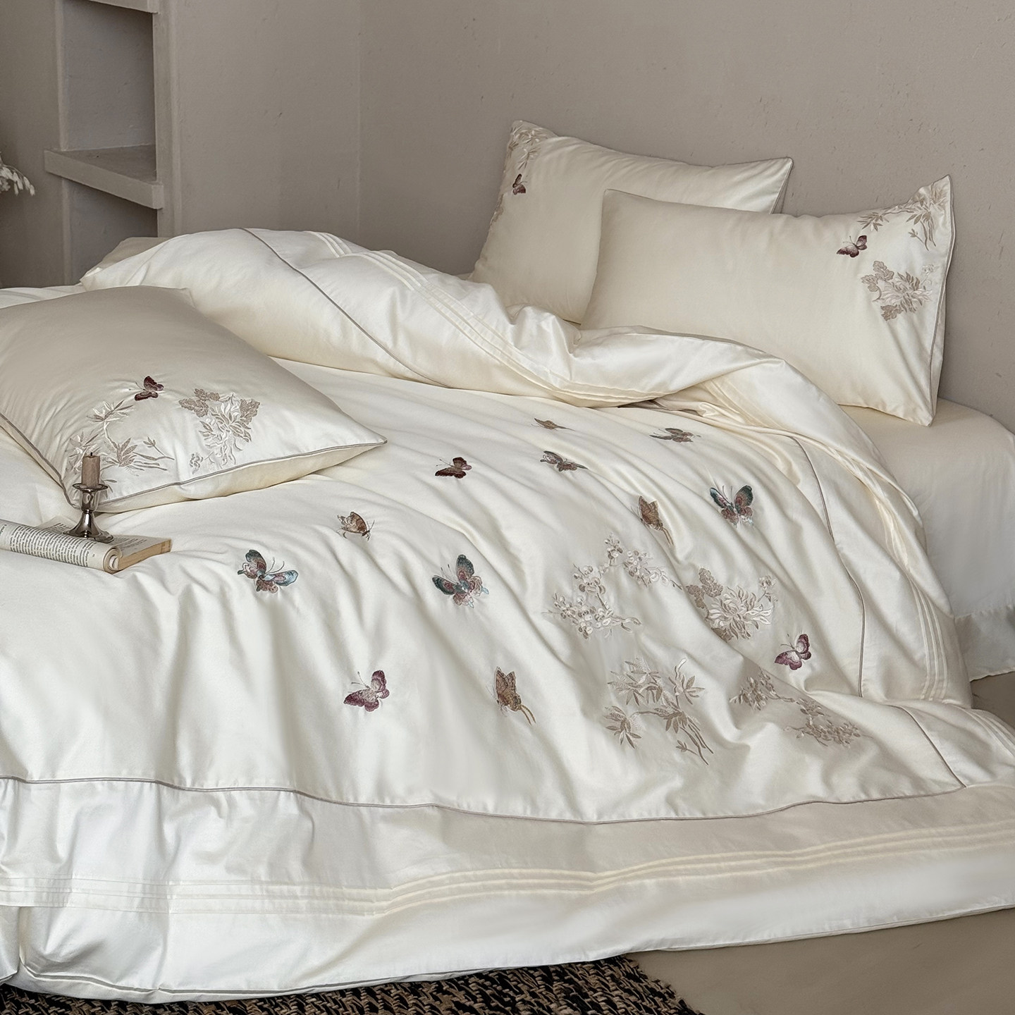 法式 轻奢全棉长绒棉四件套蝴蝶刺绣被套高级感纯棉床上用品 新中式