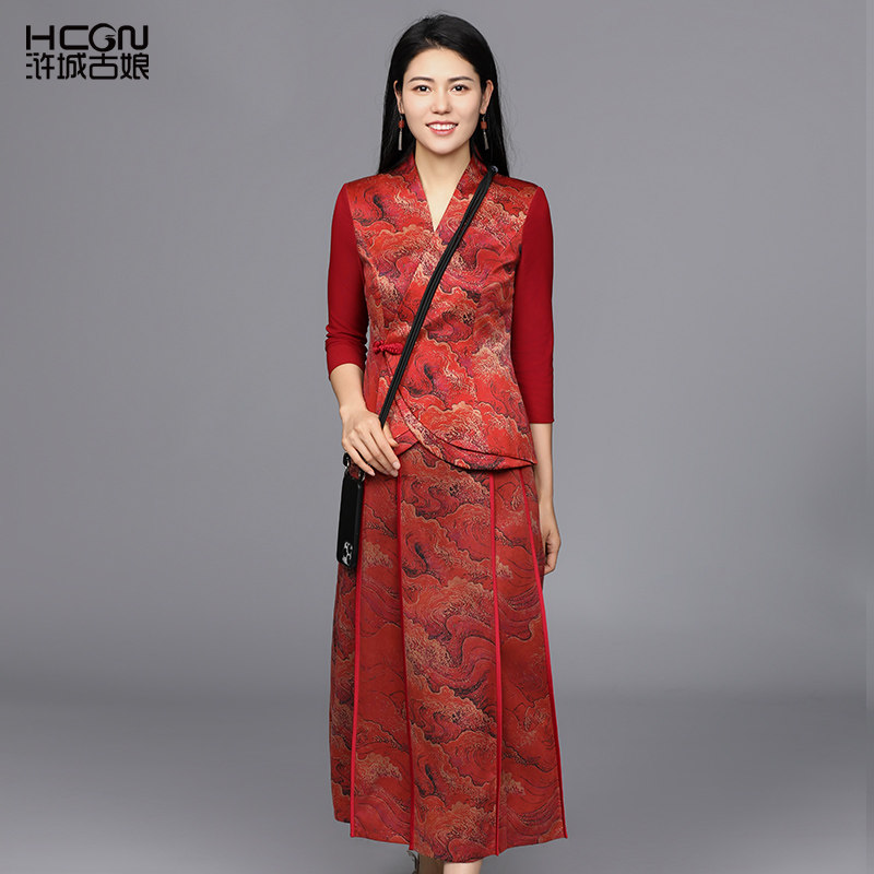 女士夏季 显瘦气质商务套裙 香云纱两件套中长裙云浪印花民族风修身由