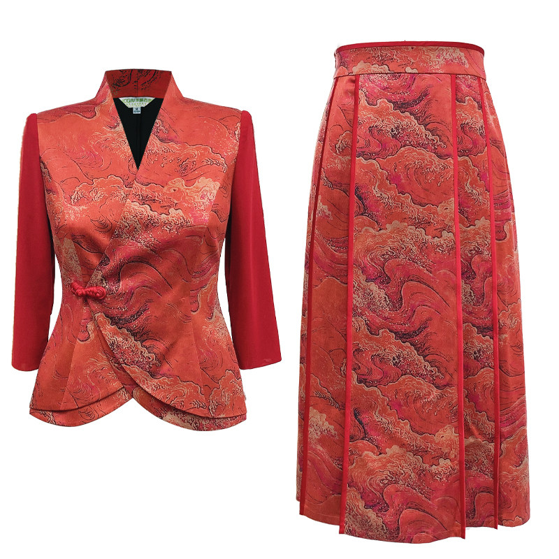 为您提供商品女士夏季 显瘦气质商务套裙 香云纱两件套中长裙云浪印花民族风修身的详细介绍,