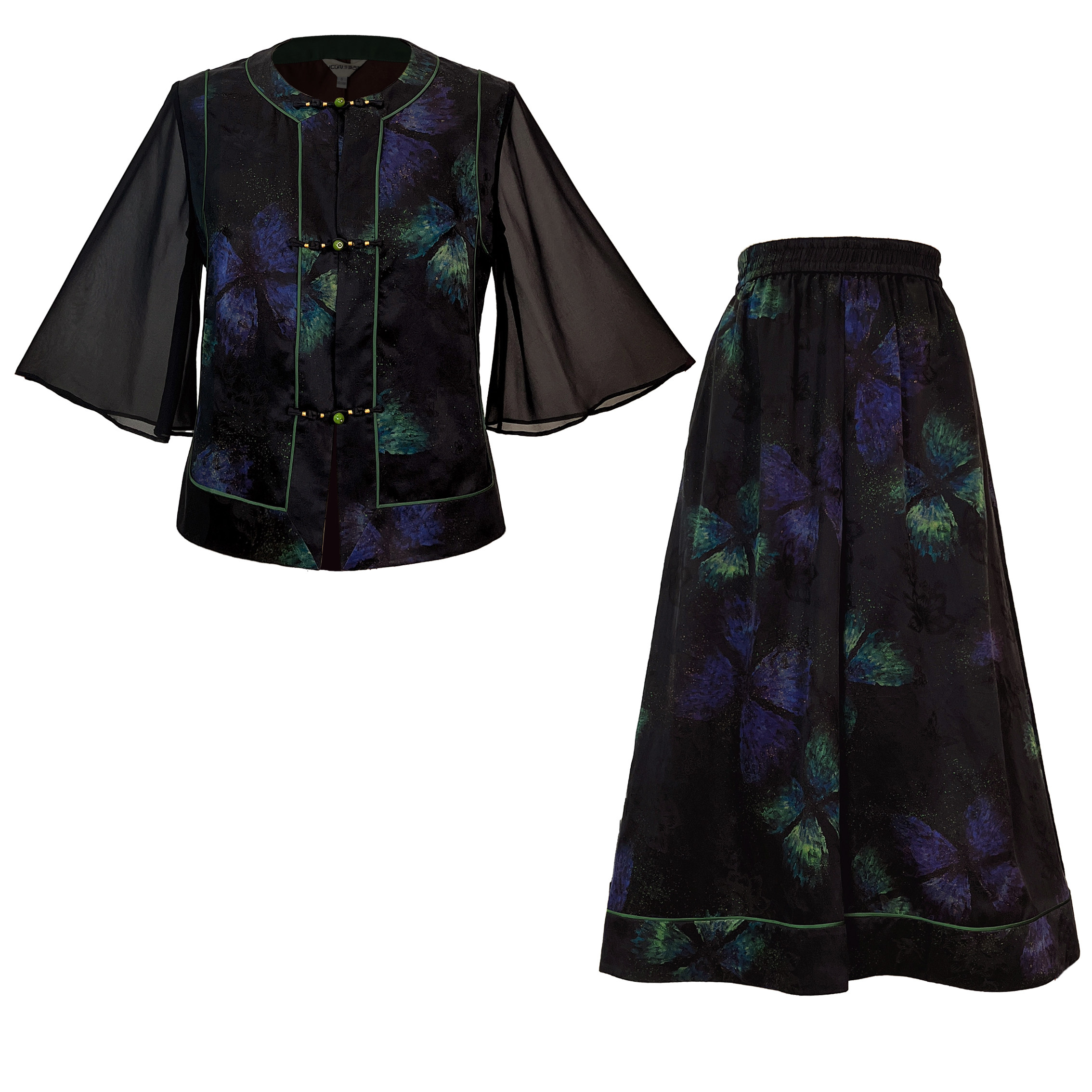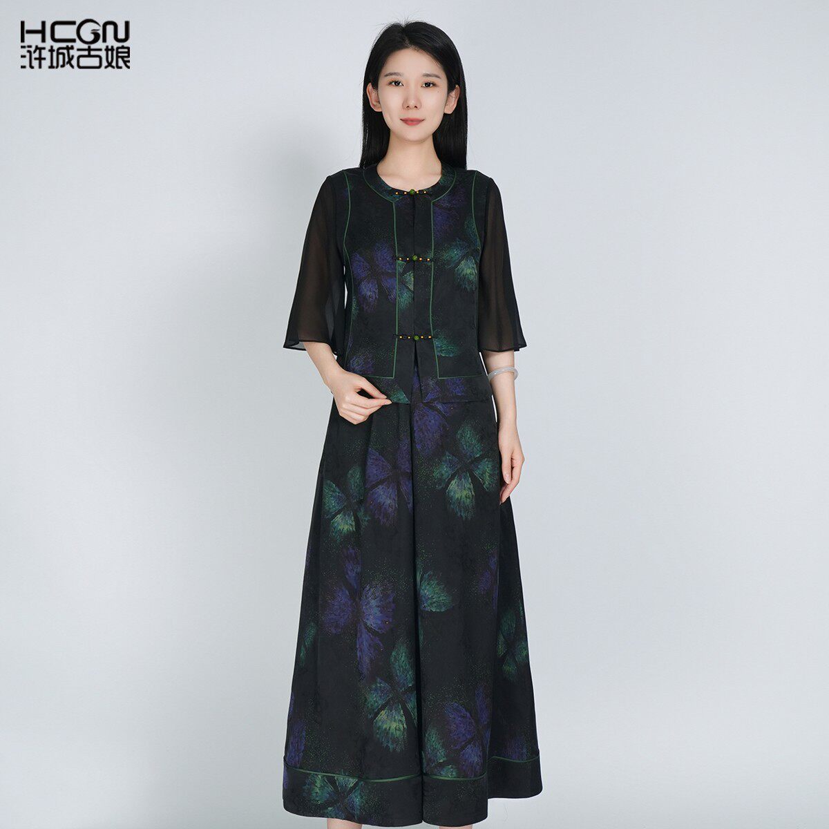 浒城古娘新款 国风套装 女夏季 桑蚕丝印花气质手工盘扣通勤新中式