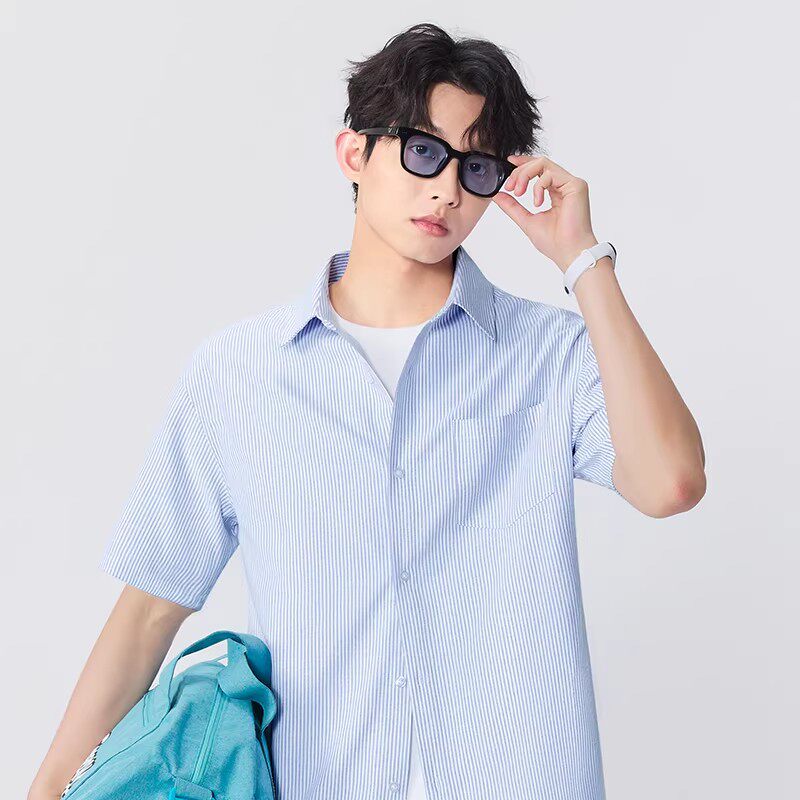 名创优品牛津纺条纹衬衫 夏季 内搭抗皱叠穿翻领长袖 衬衣春Y 男短袖