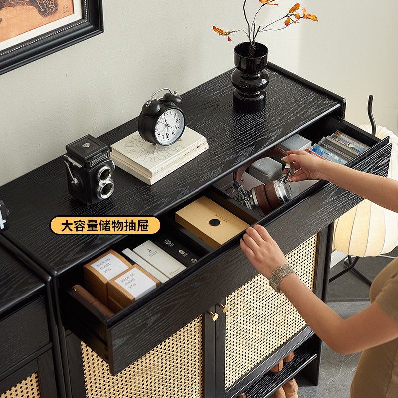 日式 柜家用门口大容量收纳柜黑色入户玄关柜一体藤编储物柜 实木鞋