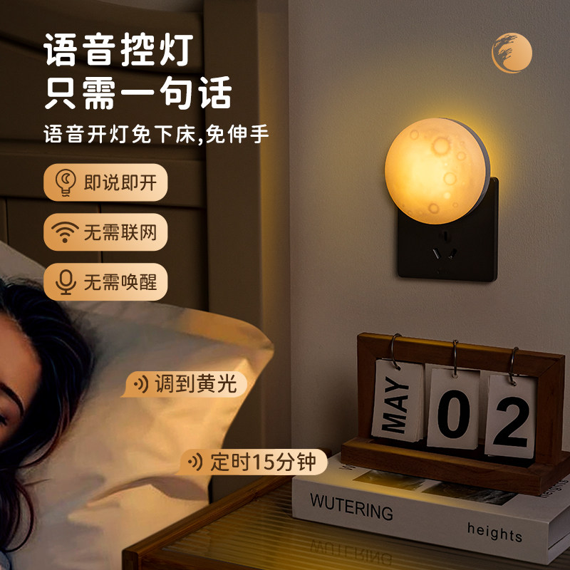 夜间声控感应灯卧室睡眠床头月球灯 语音控制智能小夜灯遥控插电款