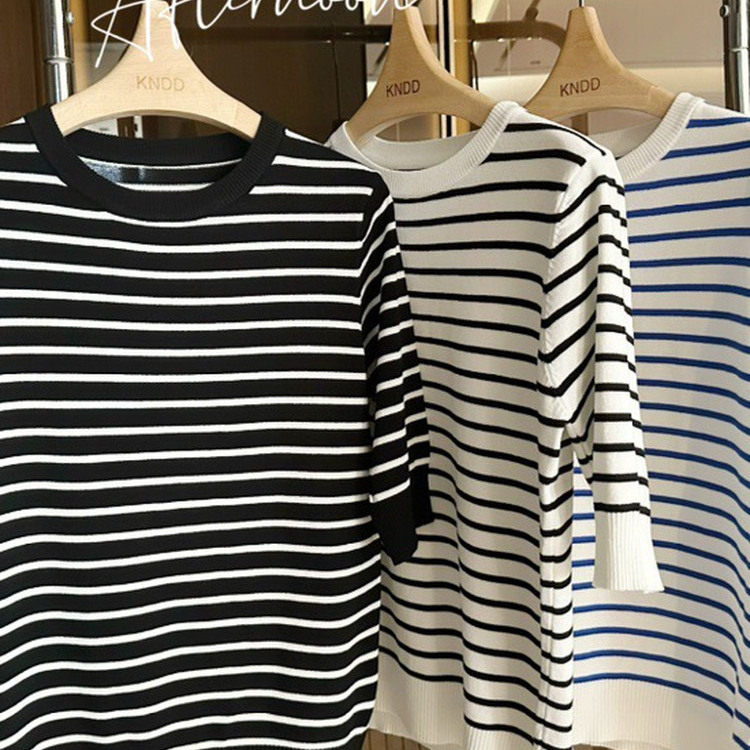 针织衫 短袖 条纹针织薄款 T恤上衣 宽松大码 圆领半袖 女夏季 复古经典