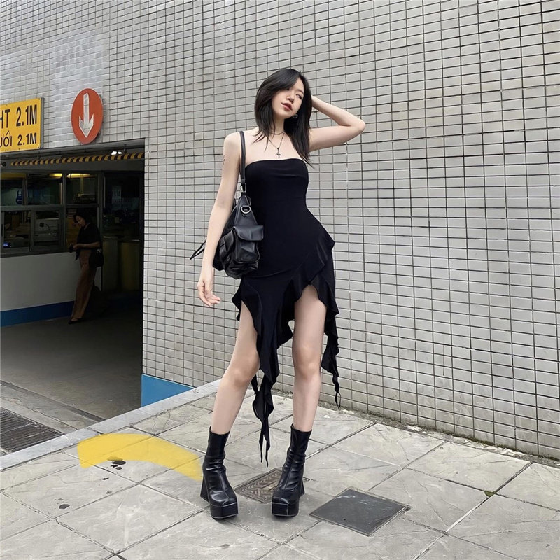黑色吊带连衣裙女春夏外穿小个子网纱长裙内搭打底显瘦不规则裙子