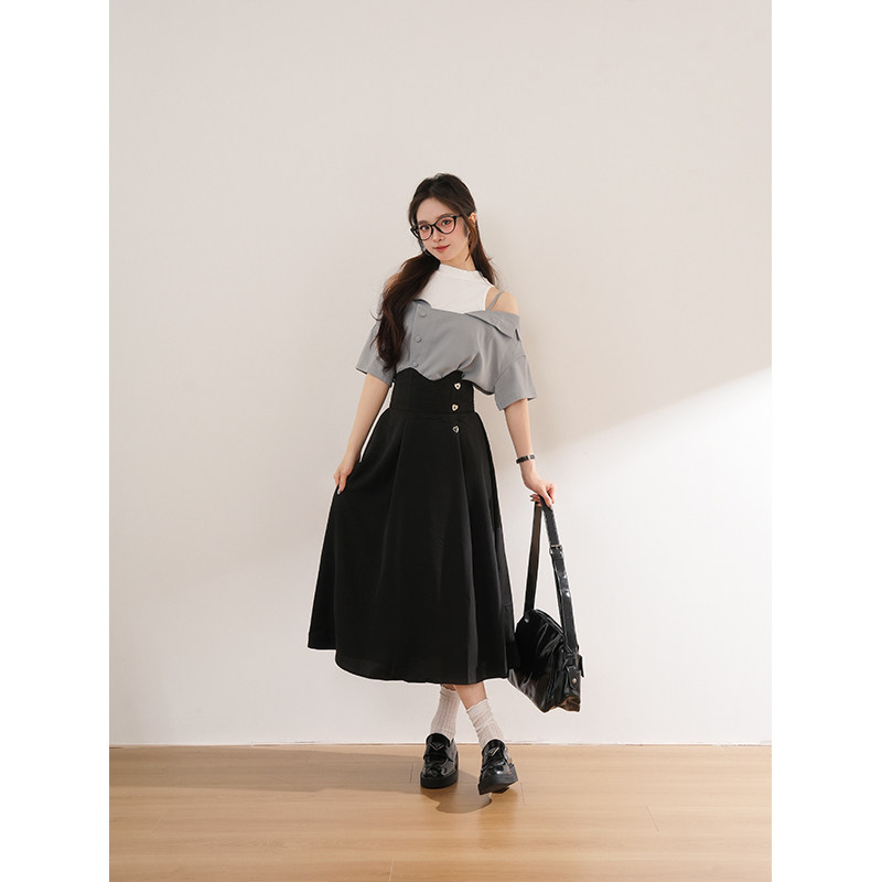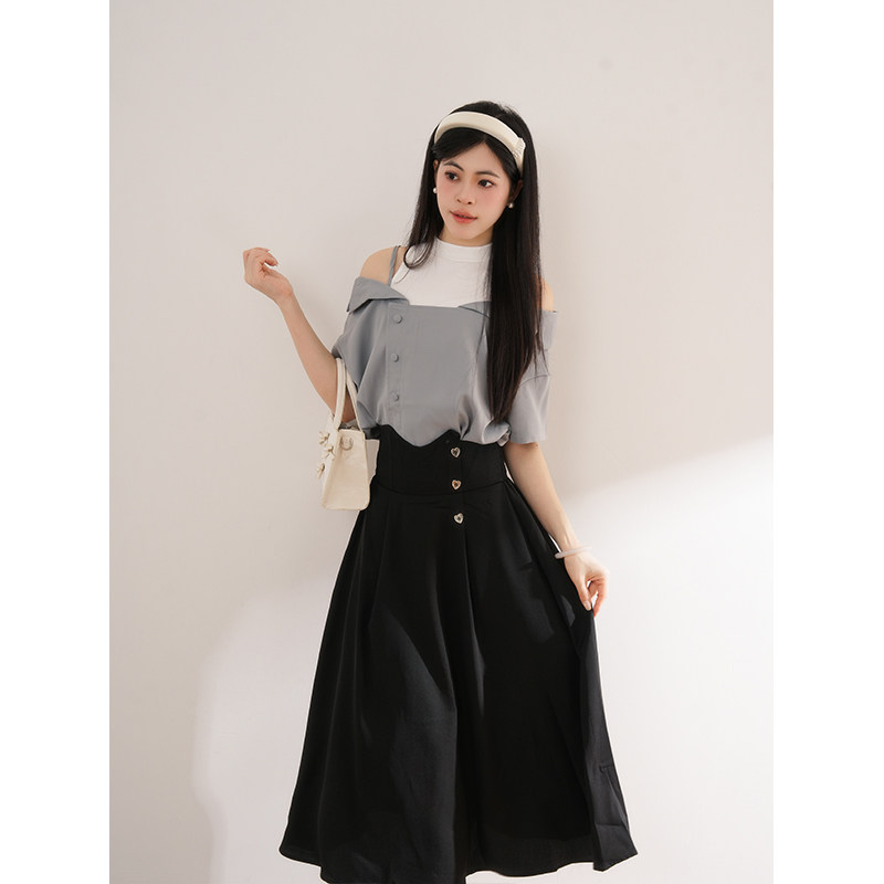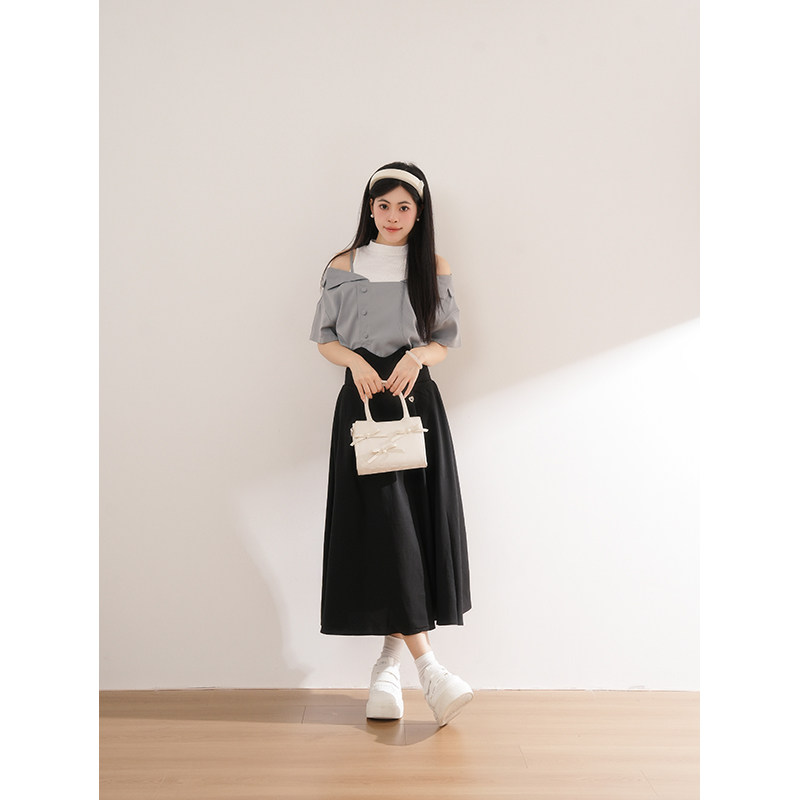 显瘦夏高腰露肩套装 一整套女 少女蓝色上衣半身裙中长款 花弦月下由