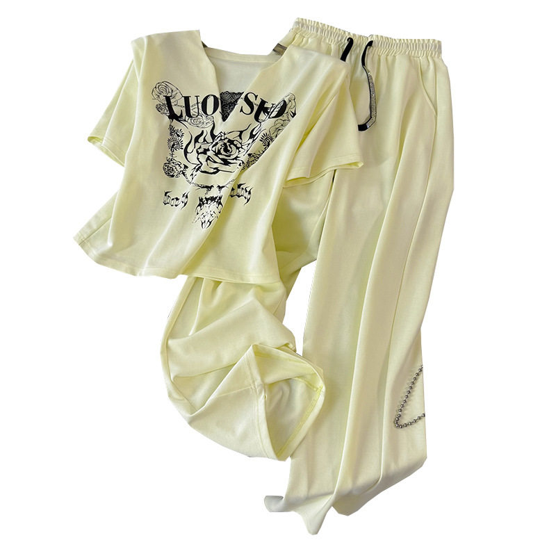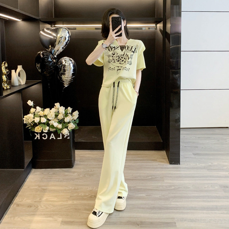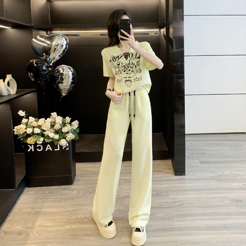 夏季 女洋气减龄显瘦短袖 T恤阔腿裤 两件套 设计感小众休闲运动套装