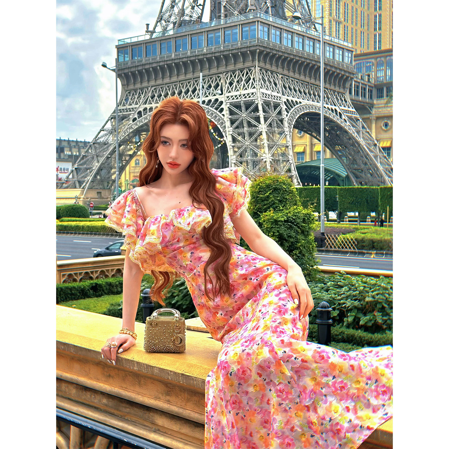 方领度假风连衣裙女新款 显瘦辣妹收腰碎花油画连衣裙 法式 孙瑜儿