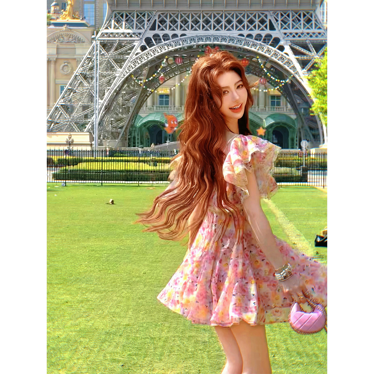 方领度假风连衣裙女新款 显瘦辣妹收腰碎花油画连衣裙 法式 孙瑜儿由