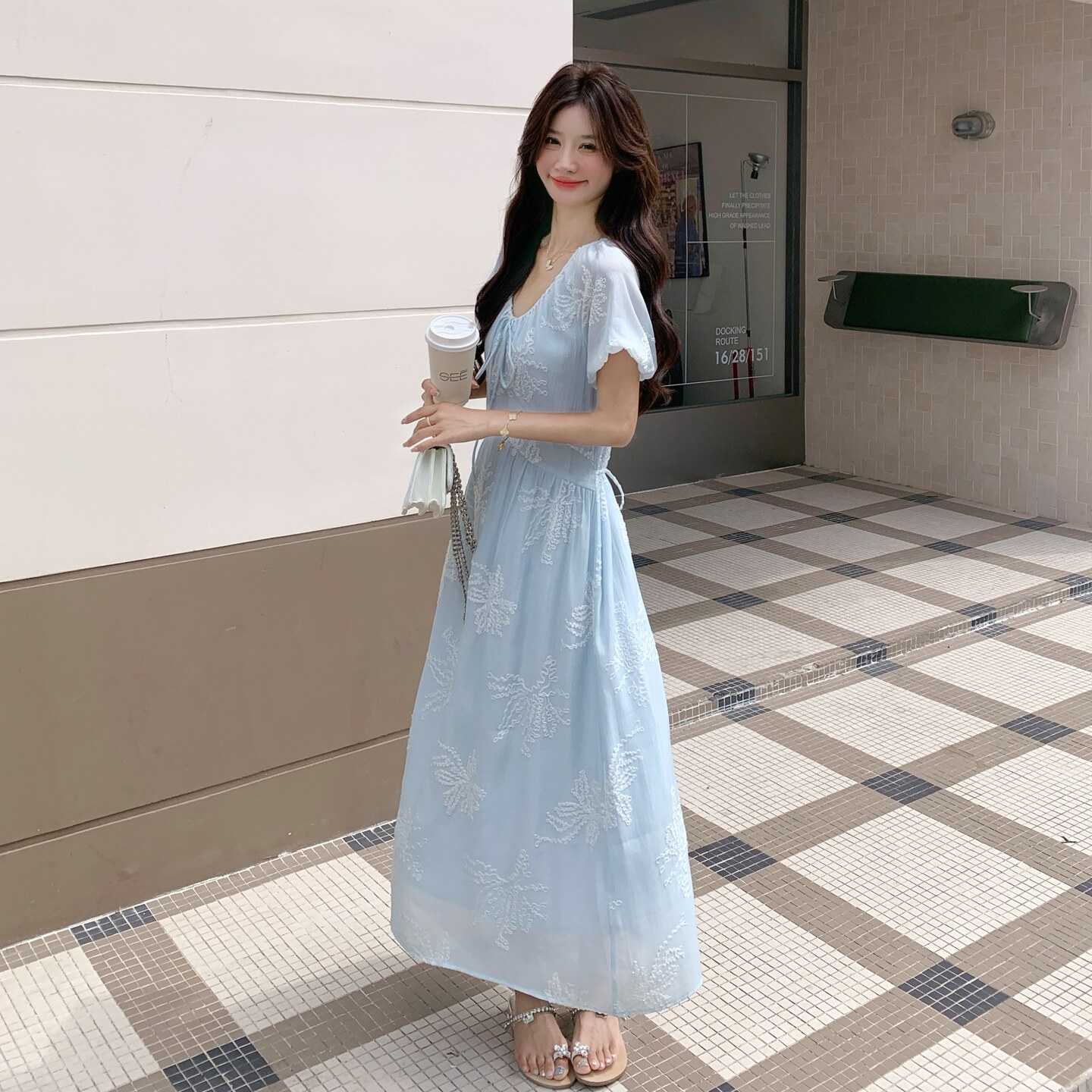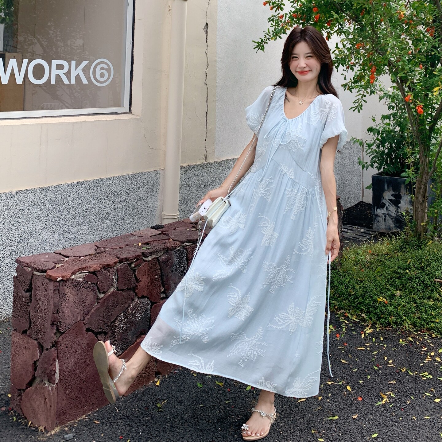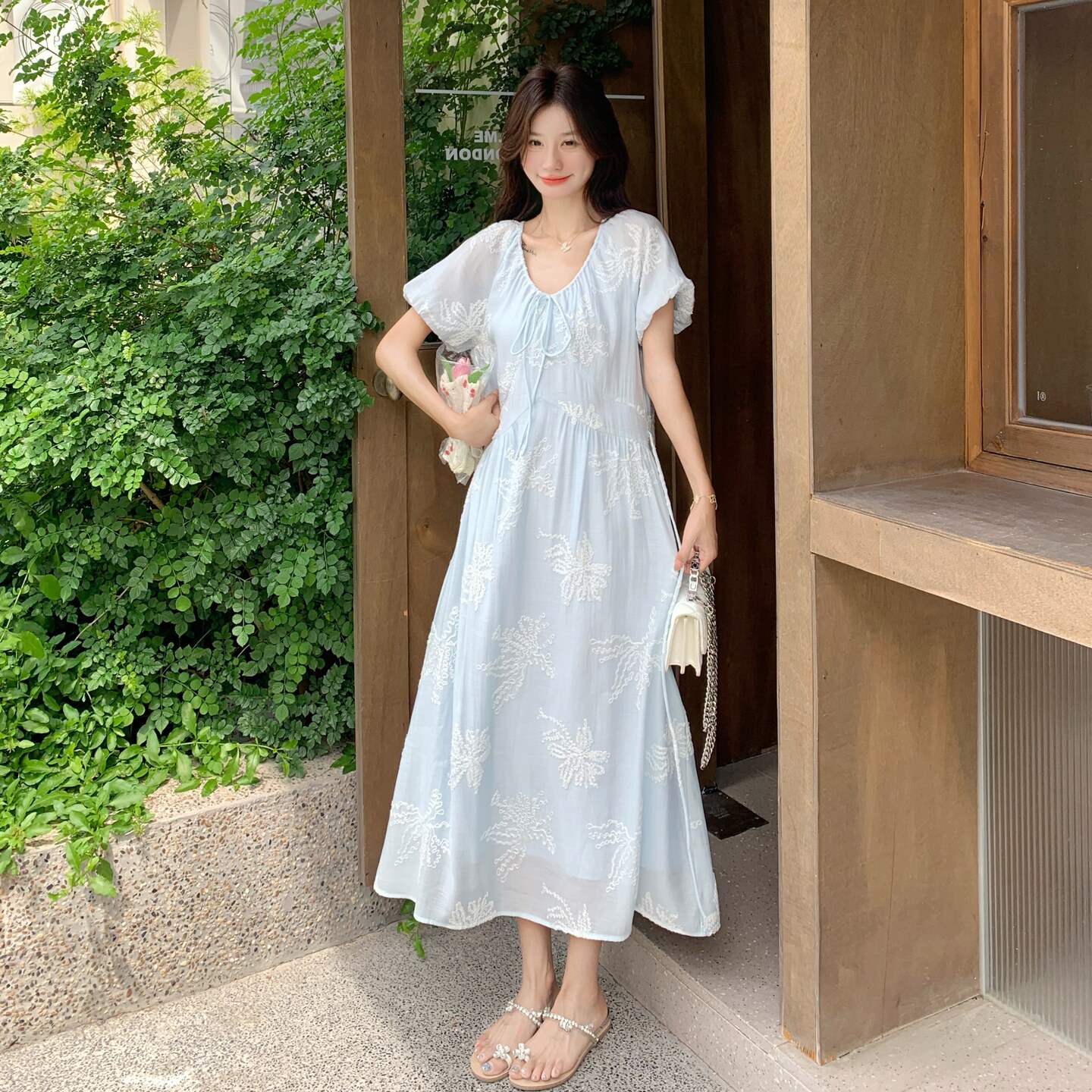 RUISHI芮时 花朵系带宽松度假风荷叶边连衣裙子女夏 云絮柔漾