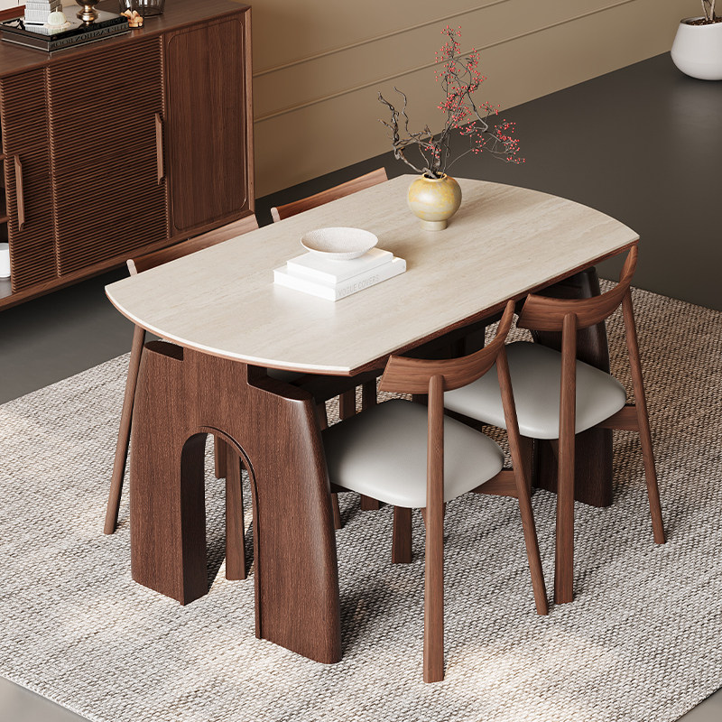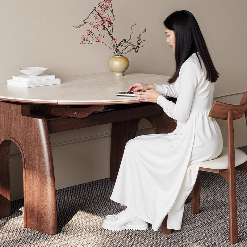帕沙曼全托底板岩板餐桌家用小户型可伸缩胡桃木色实木脚可变圆桌