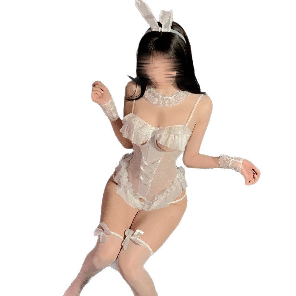 蕾丝镂空qqny情调角色扮演睡衣 性感纯欲兔女郎cos连体衣V领无袖